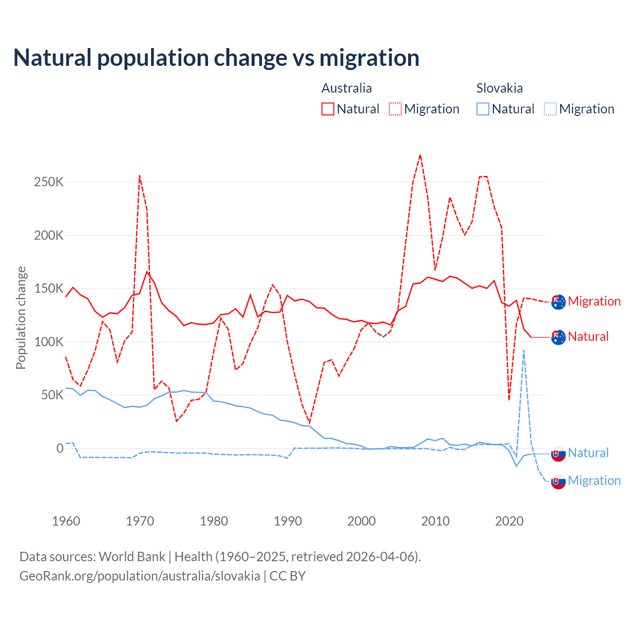 Over the last 10 years, 43.6% of the population change in Australia is from natural causes (a gain of 1,389,408 people) and 56.4% is from migration (a gain of 1,798,171 people). In Slovakia 7.47% is from natural causes (a loss of 8,728 people) and 92.5% is from migration (a gain of 108,156 people).