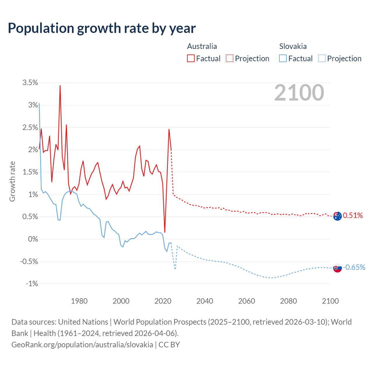 - For the last 10 years, Australia has had an average growth rate of +1.49% per year vs +0.01% in Slovakia.