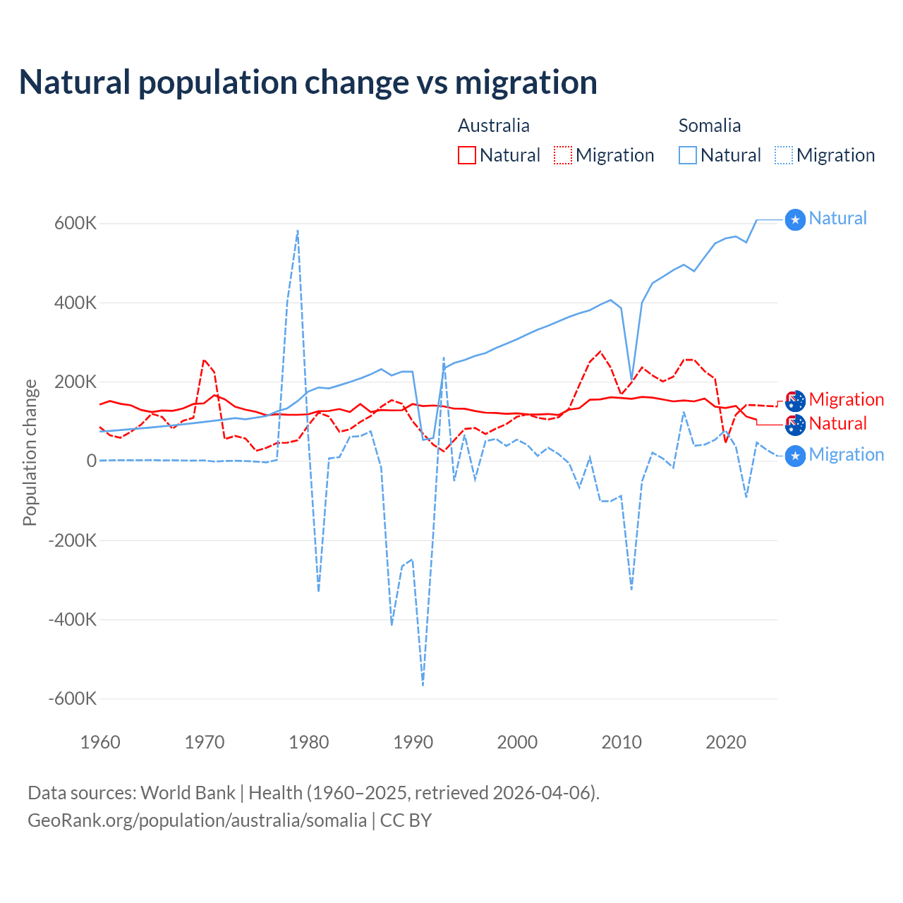 Over the last 10 years, 43.6% of the population change in Australia is from natural causes (a gain of 1,389,408 people) and 56.4% is from migration (a gain of 1,798,171 people). In Somalia 94.4% is from natural causes (a gain of 5,270,105 people) and 5.58% is from migration (a gain of 311,487 people).
