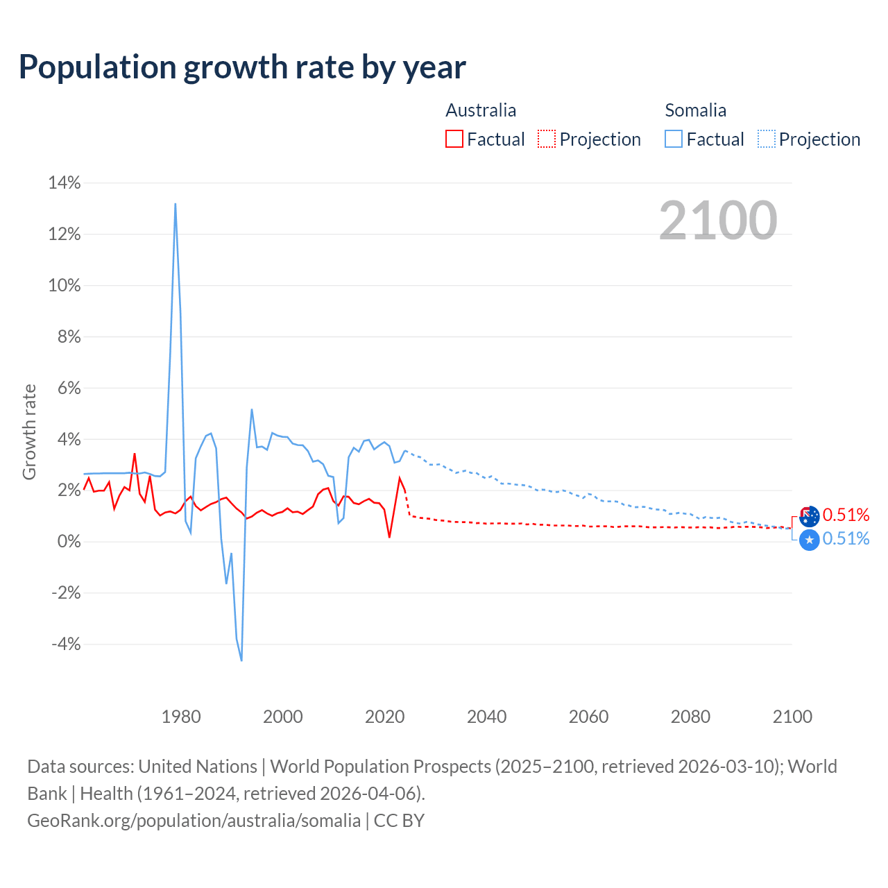 - For the last 10 years, Australia has had an average growth rate of +1.49% per year vs +3.61% in Somalia.