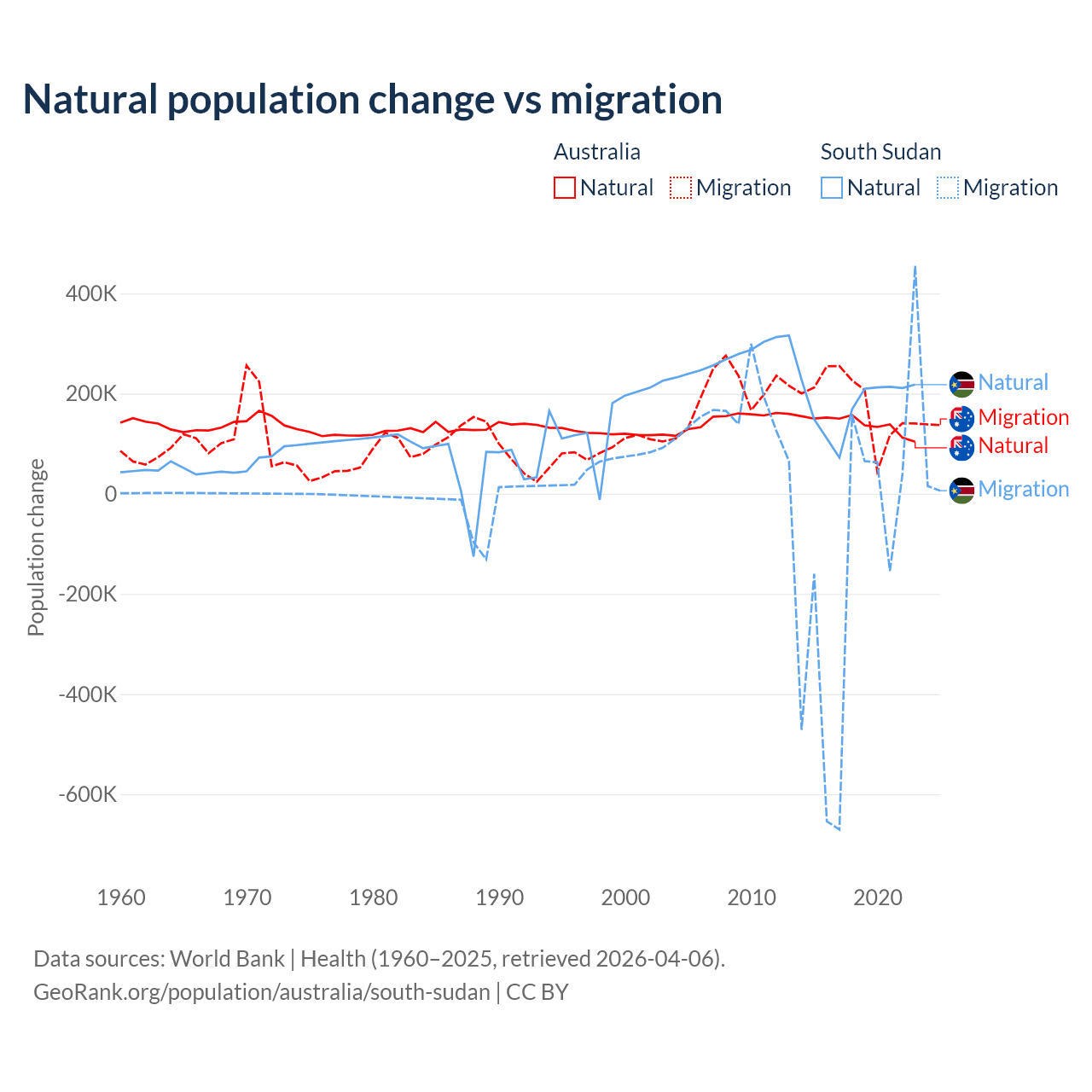 Over the last 10 years, 43.6% of the population change in Australia is from natural causes (a gain of 1,389,408 people) and 56.4% is from migration (a gain of 1,798,171 people). In South Sudan 57.4% is from natural causes (a gain of 1,792,135 people) and 42.6% is from migration (a loss of 1,329,606 people).