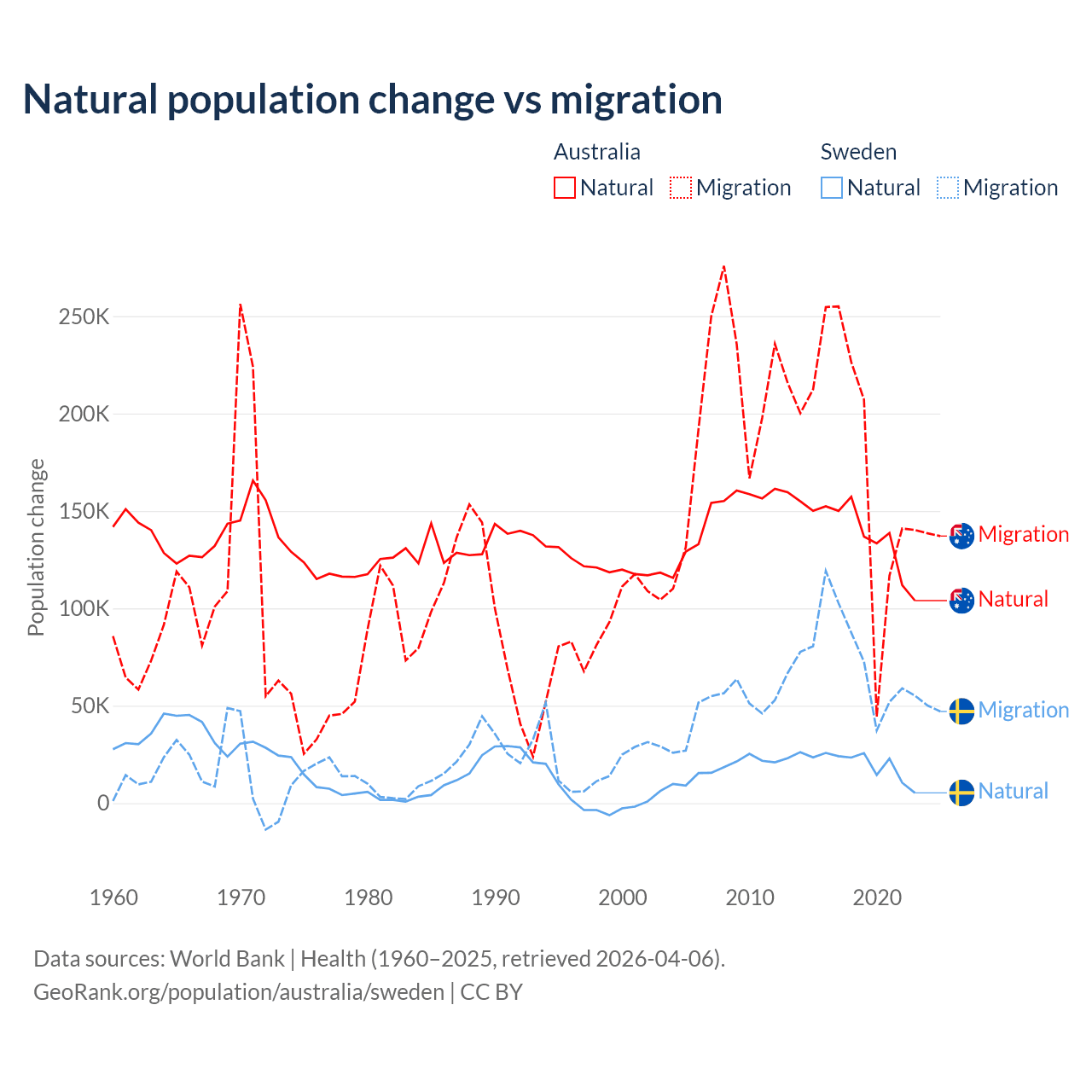 Over the last 10 years, 43.6% of the population change in Australia is from natural causes (a gain of 1,389,408 people) and 56.4% is from migration (a gain of 1,798,171 people). In Sweden 21.4% is from natural causes (a gain of 201,900 people) and 78.6% is from migration (a gain of 743,642 people).