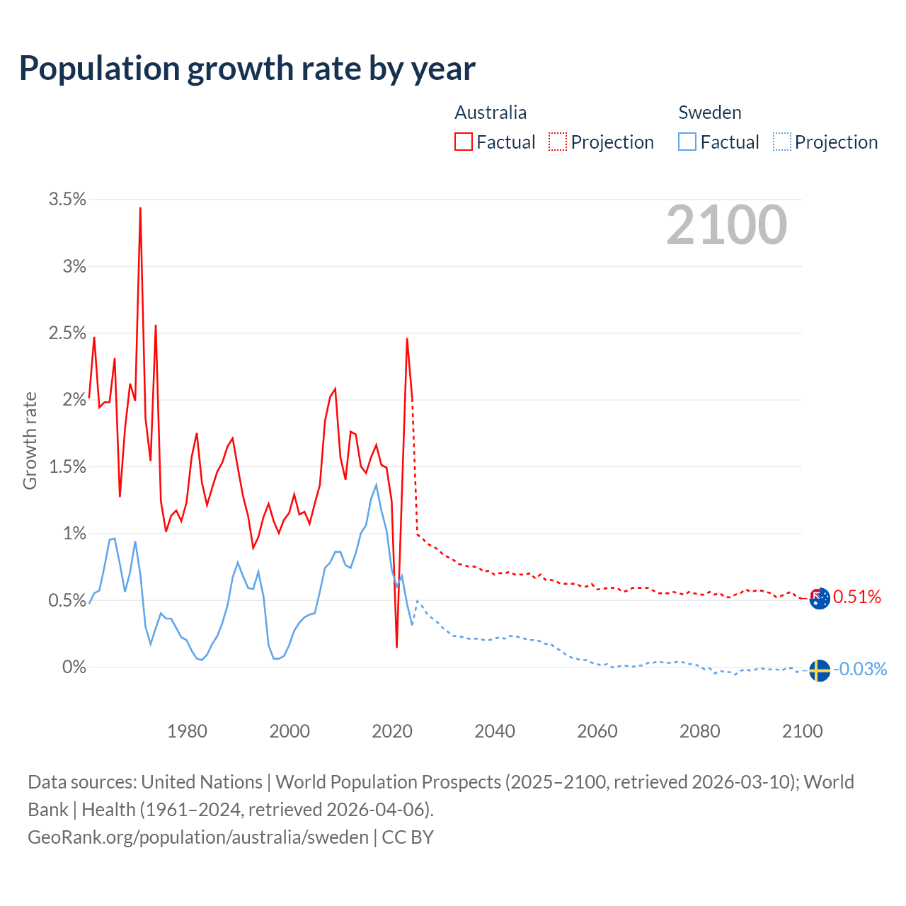- For the last 10 years, Australia has had an average growth rate of +1.49% per year vs +0.88% in Sweden.