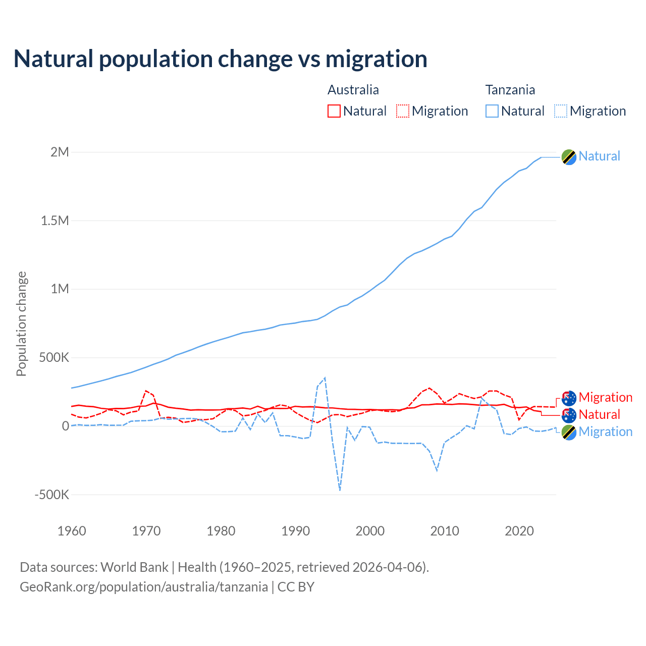 Over the last 10 years, 43.6% of the population change in Australia is from natural causes (a gain of 1,389,408 people) and 56.4% is from migration (a gain of 1,798,171 people). In Tanzania 98.7% is from natural causes (a gain of 17,769,541 people) and 1.27% is from migration (a gain of 229,466 people).
