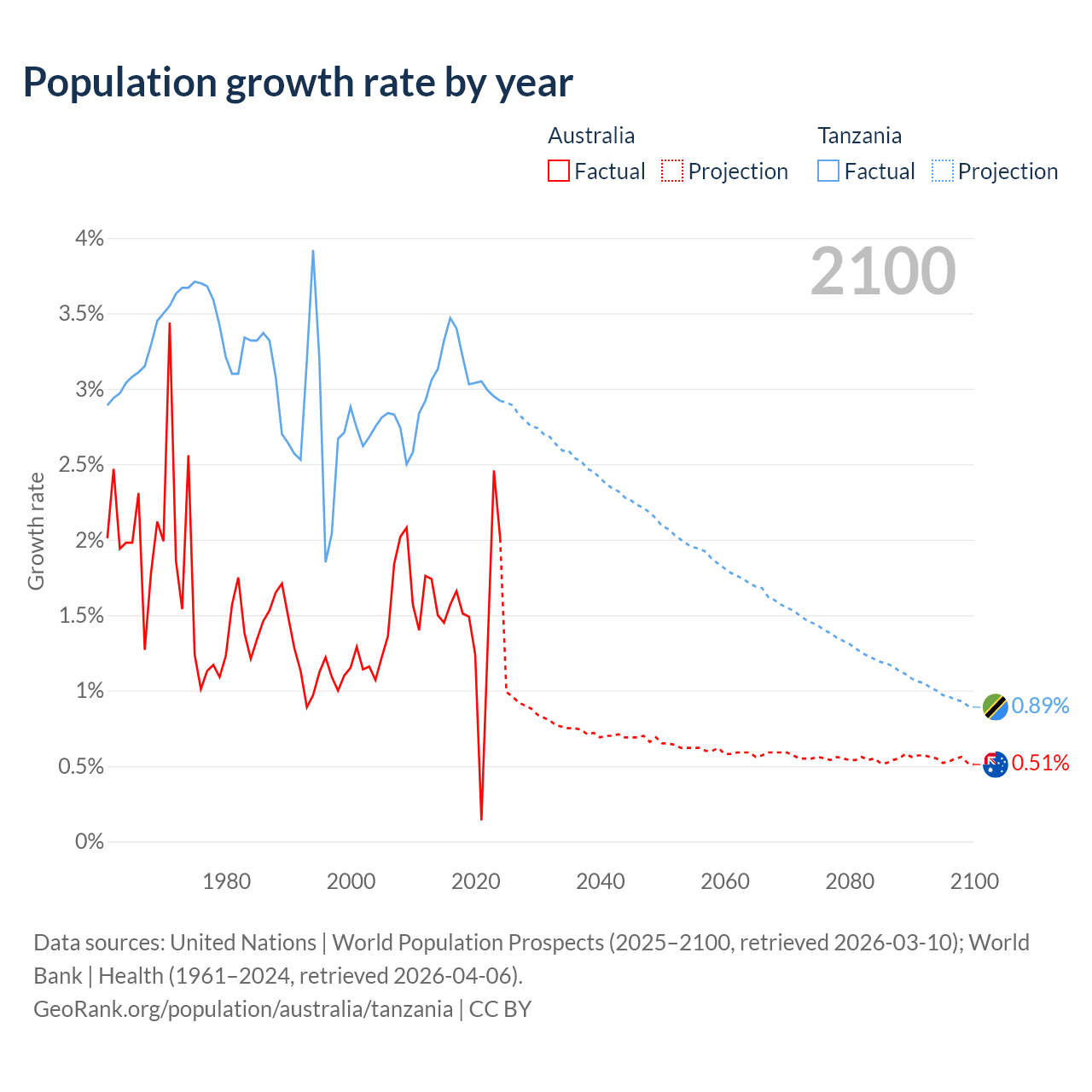 - For the last 10 years, Australia has had an average growth rate of +1.49% per year vs +3.13% in Tanzania.
