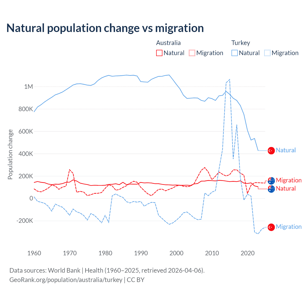 Over the last 10 years, 43.6% of the population change in Australia is from natural causes (a gain of 1,389,408 people) and 56.4% is from migration (a gain of 1,798,171 people). In Turkey 73% is from natural causes (a gain of 7,333,352 people) and 27% is from migration (a gain of 2,718,916 people).