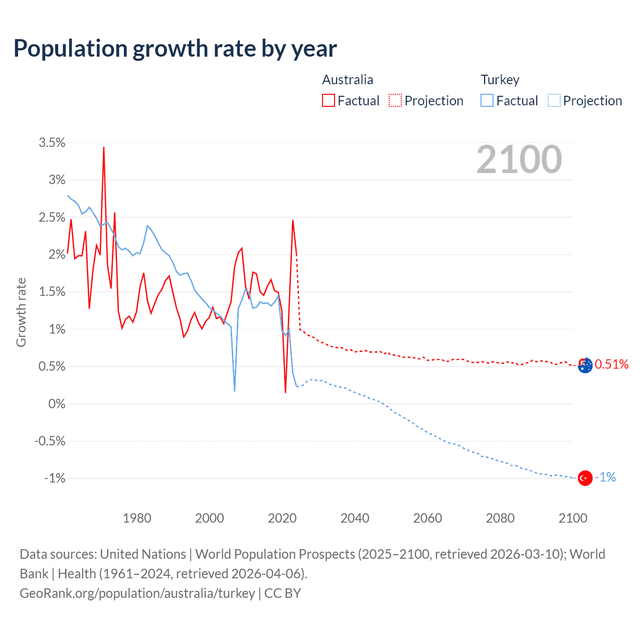 Data sources: World Bank | Health (1960–2024, retrieved 2026-04-06); United Nations | World Population Prospects (1960–2026, retrieved 2026-03-10); U.S. Census Bureau (1960–2025, retrieved 2026-02-08); Central Intelligence Agency (CIA) (2000–2019, retrieved 2026-02-20).