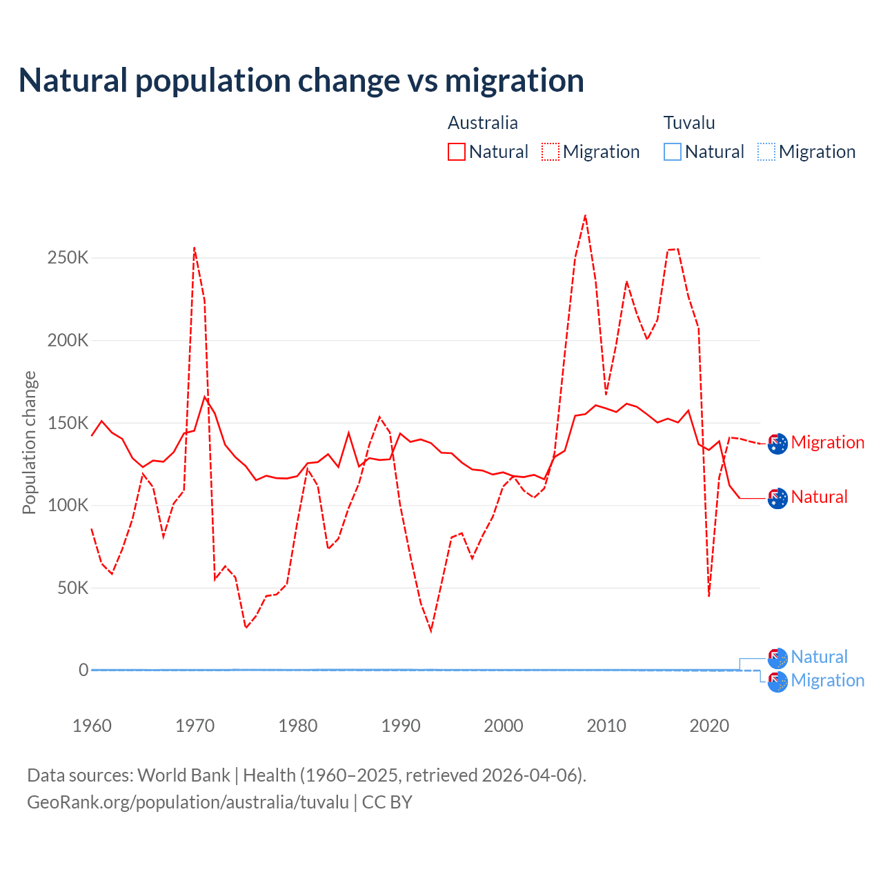 Over the last 10 years, 43.6% of the population change in Australia is from natural causes (a gain of 1,389,408 people) and 56.4% is from migration (a gain of 1,798,171 people). In Tuvalu 35.5% is from natural causes (a gain of 1,556 people) and 64.5% is from migration (a loss of 2,827 people).