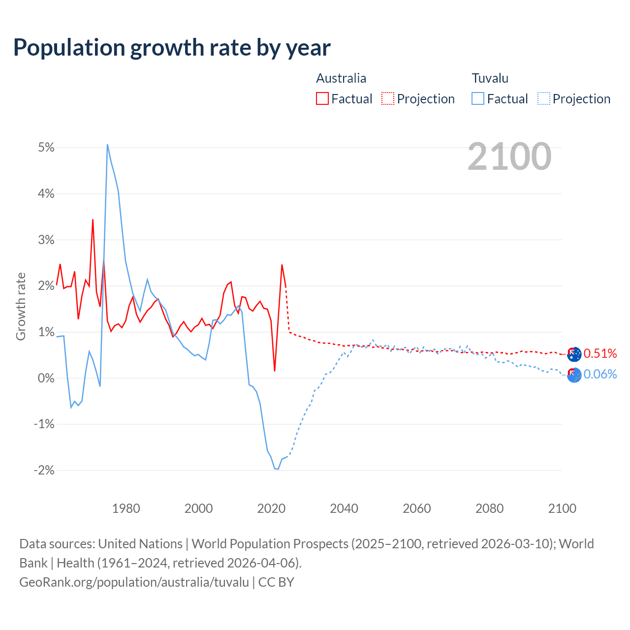 - For the last 10 years, Australia has had an average growth rate of +1.49% per year vs -1.19% in Tuvalu.