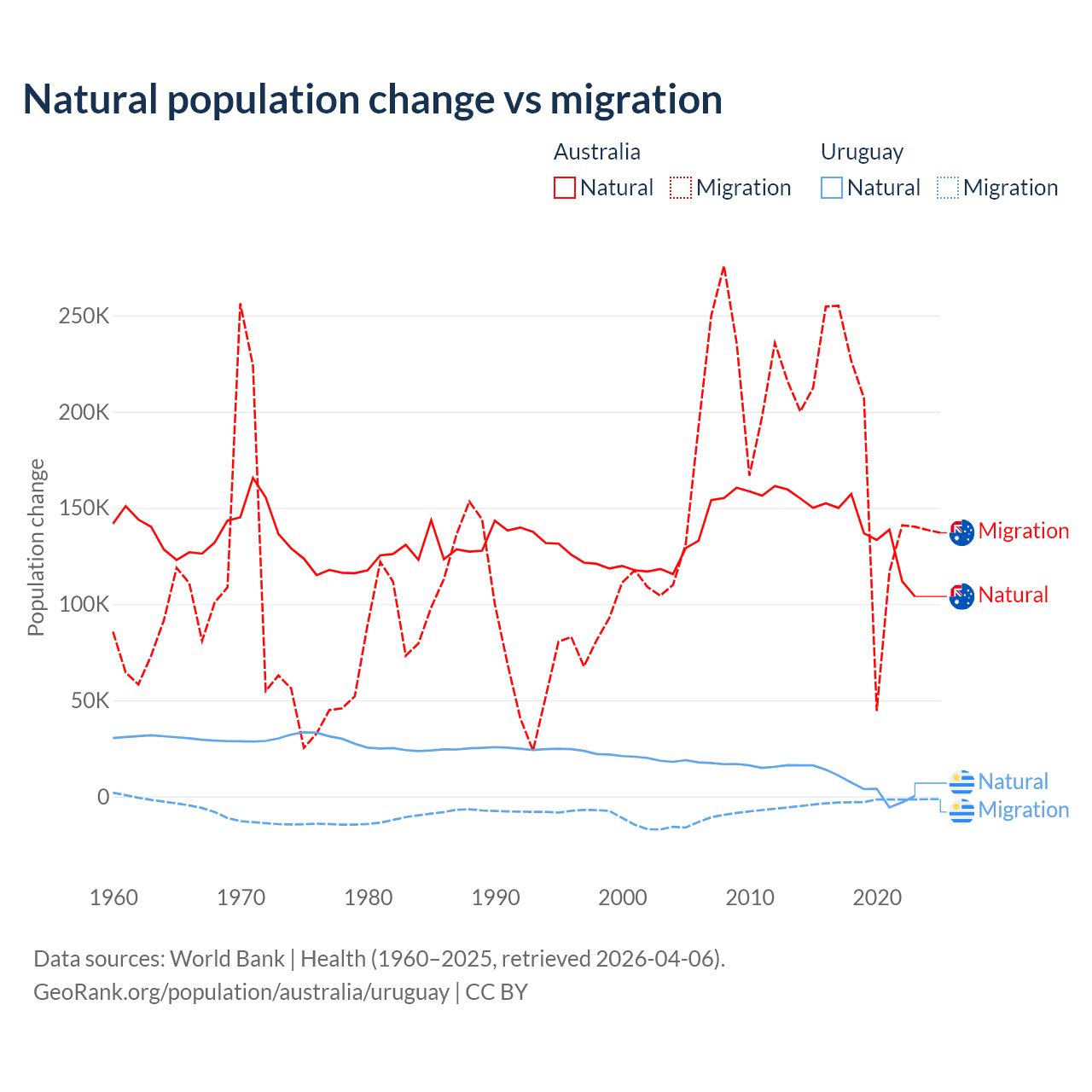 Over the last 10 years, 43.6% of the population change in Australia is from natural causes (a gain of 1,389,408 people) and 56.4% is from migration (a gain of 1,798,171 people). In Uruguay 70% is from natural causes (a gain of 64,303 people) and 30% is from migration (a loss of 27,501 people).