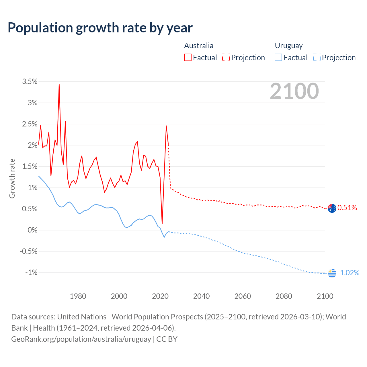 - For the last 10 years, Australia has had an average growth rate of +1.49% per year vs +0.11% in Uruguay.