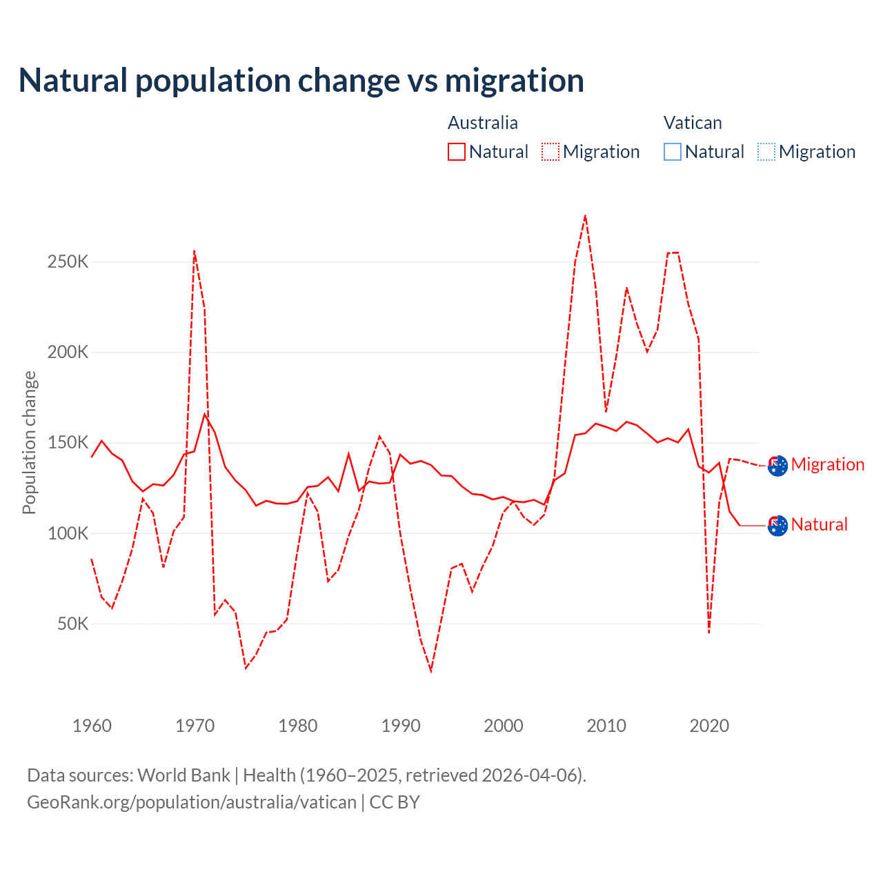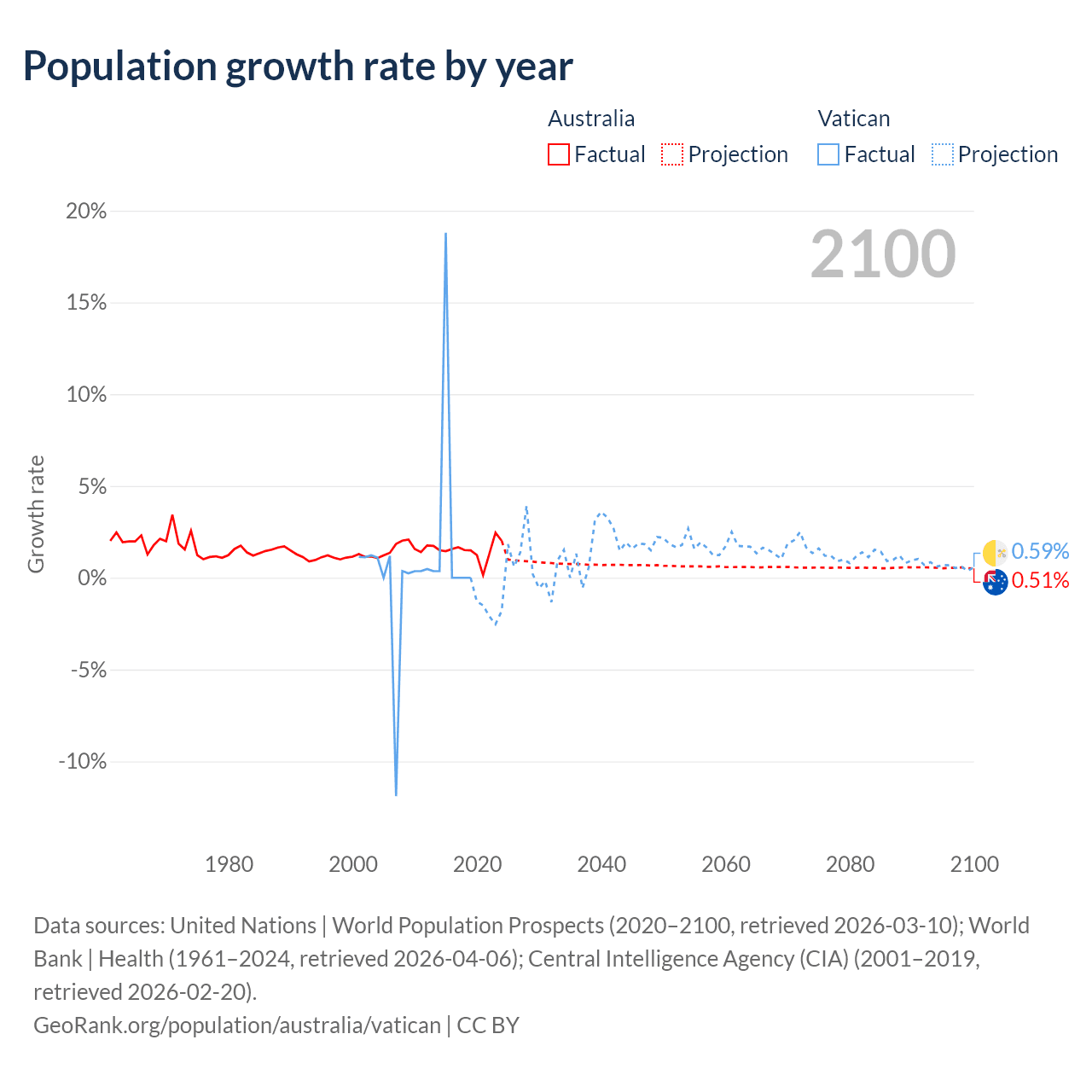 - For the last 10 years, Australia has had an average growth rate of +1.49% per year vs +1.9% in the Vatican.