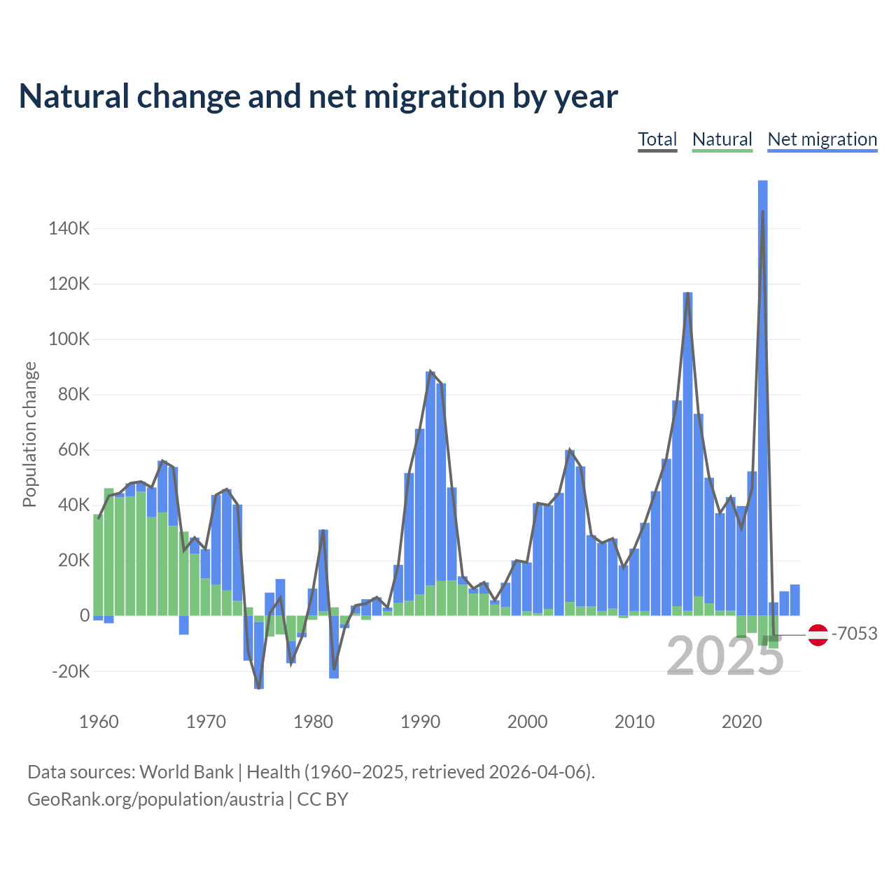 Over the last 10 years, 2.61% of the population change in Austria is from natural causes (a loss of 16,936 people) and 97.4% is from migration (a gain of 631,325 people).