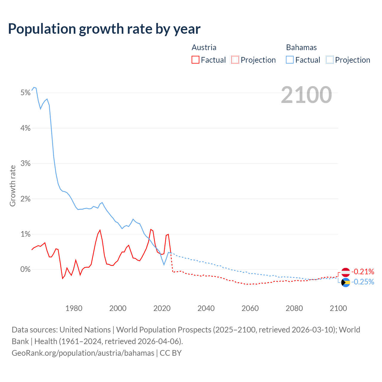 - For the last 10 years, Austria has had an average growth rate of +0.72% per year vs +0.52% in the Bahamas.