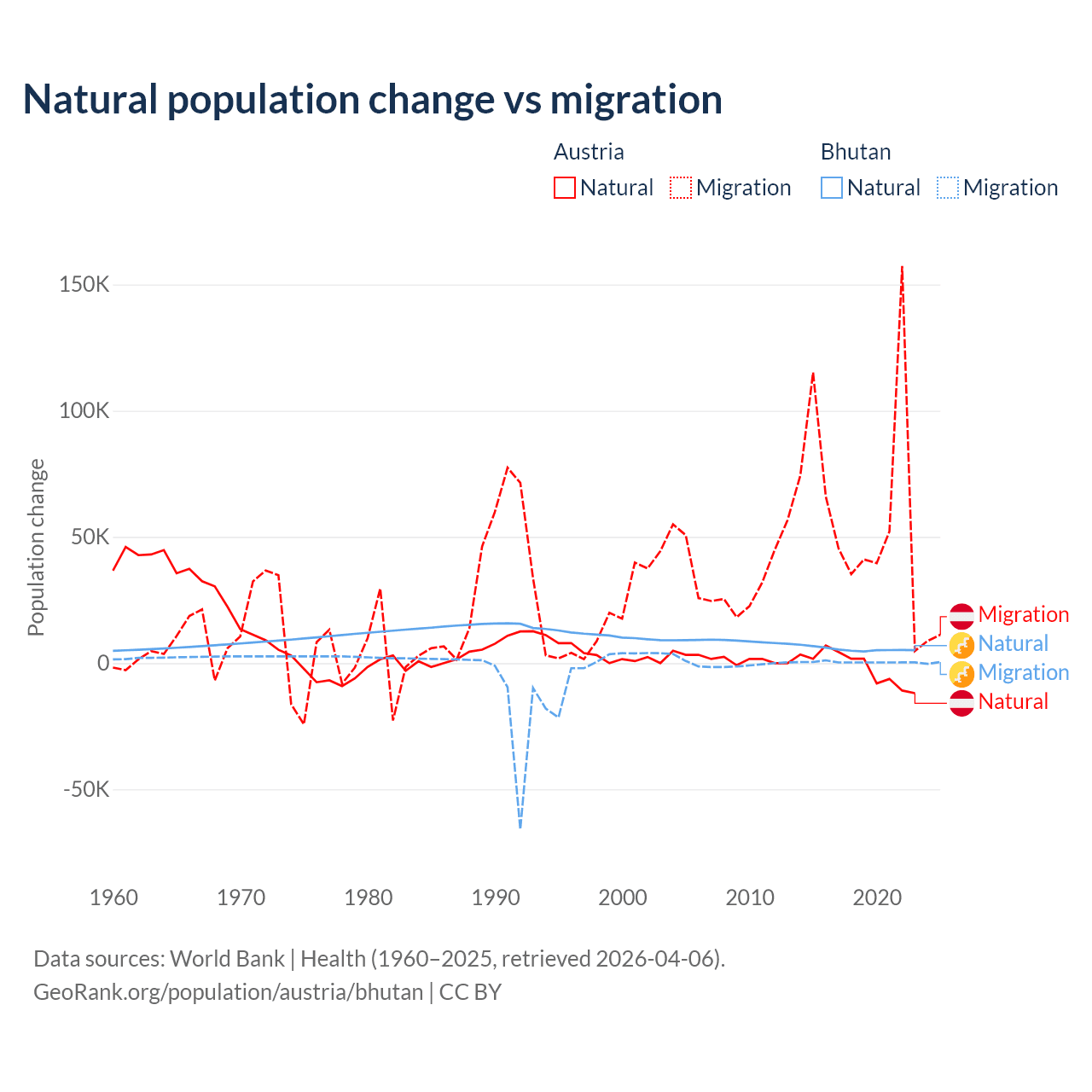 Over the last 10 years, 2.61% of the population change in Austria is from natural causes (a loss of 16,936 people) and 97.4% is from migration (a gain of 631,325 people). In Bhutan 93.3% is from natural causes (a gain of 55,796 people) and 6.74% is from migration (a gain of 4,035 people).