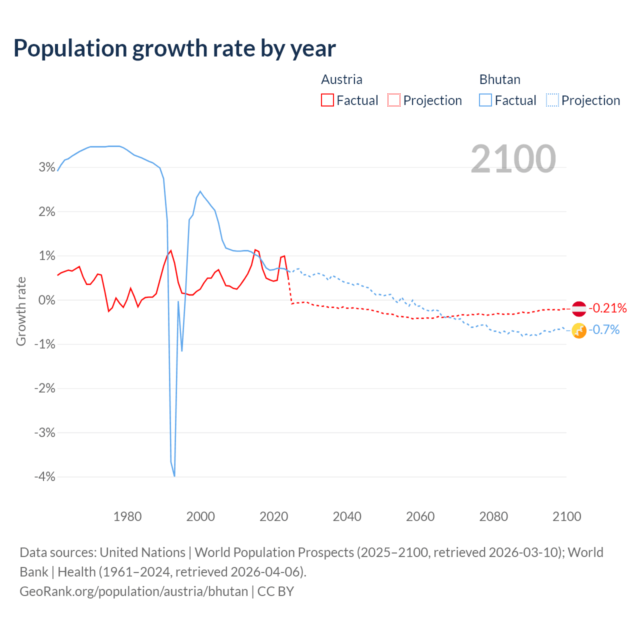 - For the last 10 years, Austria has had an average growth rate of +0.72% per year vs +0.8% in Bhutan.