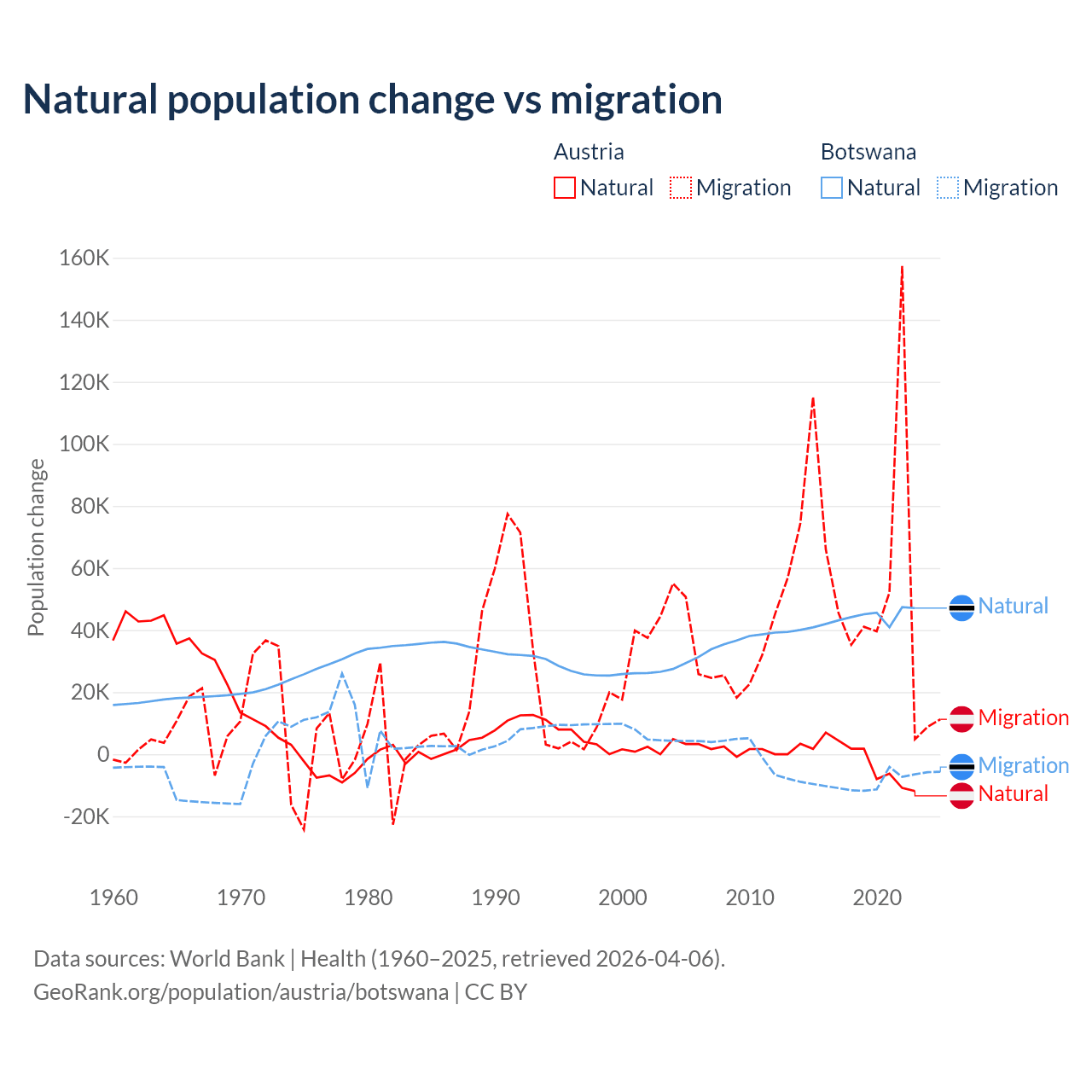 Over the last 10 years, 2.61% of the population change in Austria is from natural causes (a loss of 16,936 people) and 97.4% is from migration (a gain of 631,325 people). In Botswana 82.5% is from natural causes (a gain of 436,373 people) and 17.5% is from migration (a loss of 92,293 people).