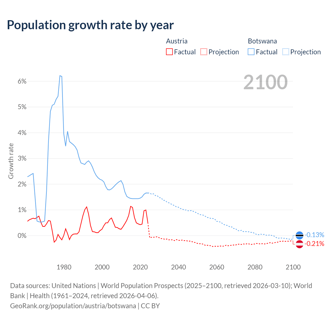 - For the last 10 years, Austria has had an average growth rate of +0.72% per year vs +1.5% in Botswana.
