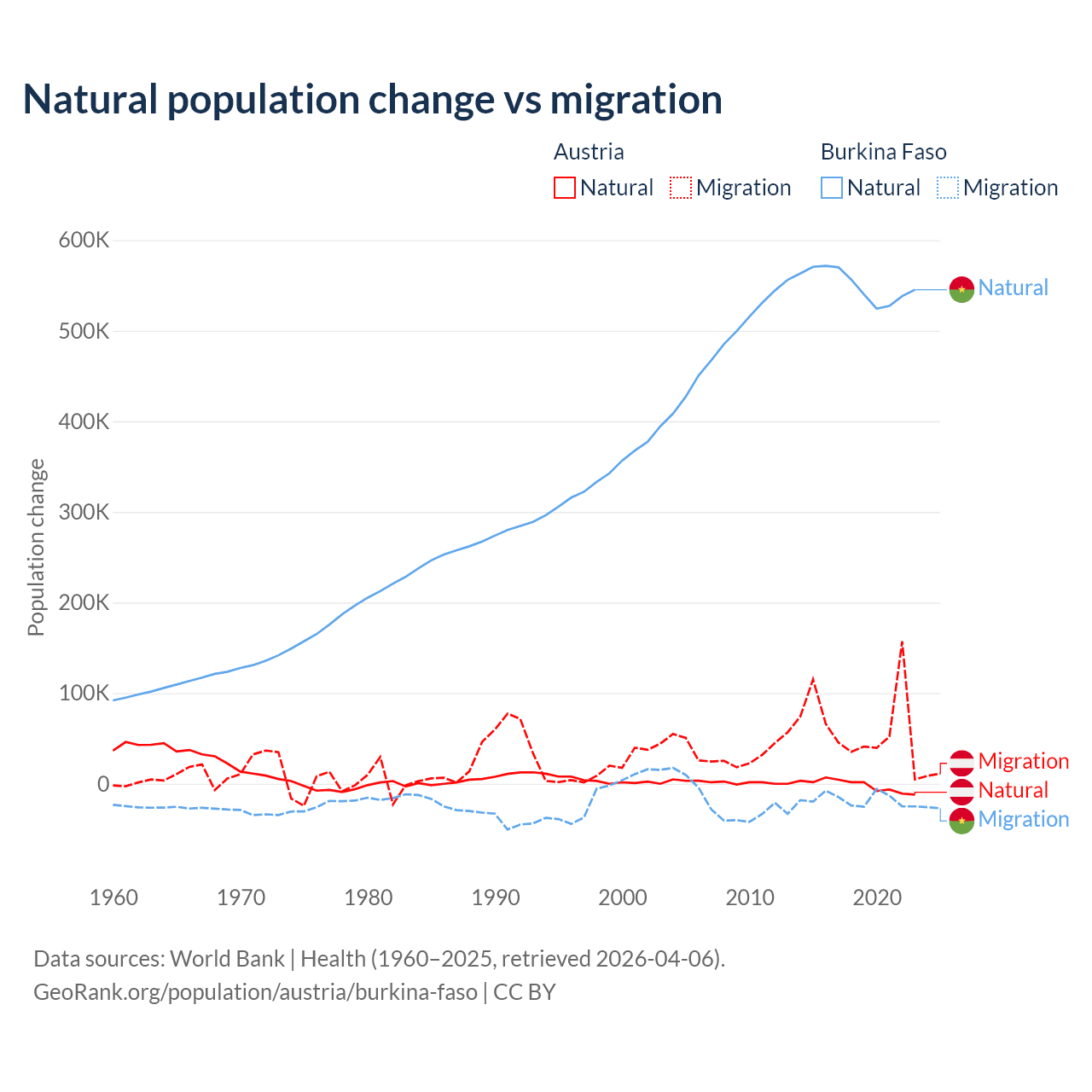 Over the last 10 years, 2.61% of the population change in Austria is from natural causes (a loss of 16,936 people) and 97.4% is from migration (a gain of 631,325 people). In Burkina Faso 96.9% is from natural causes (a gain of 5,506,960 people) and 3.13% is from migration (a loss of 177,923 people).
