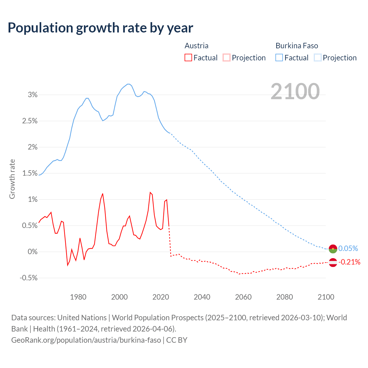 - For the last 10 years, Austria has had an average growth rate of +0.72% per year vs +2.63% in Burkina Faso.