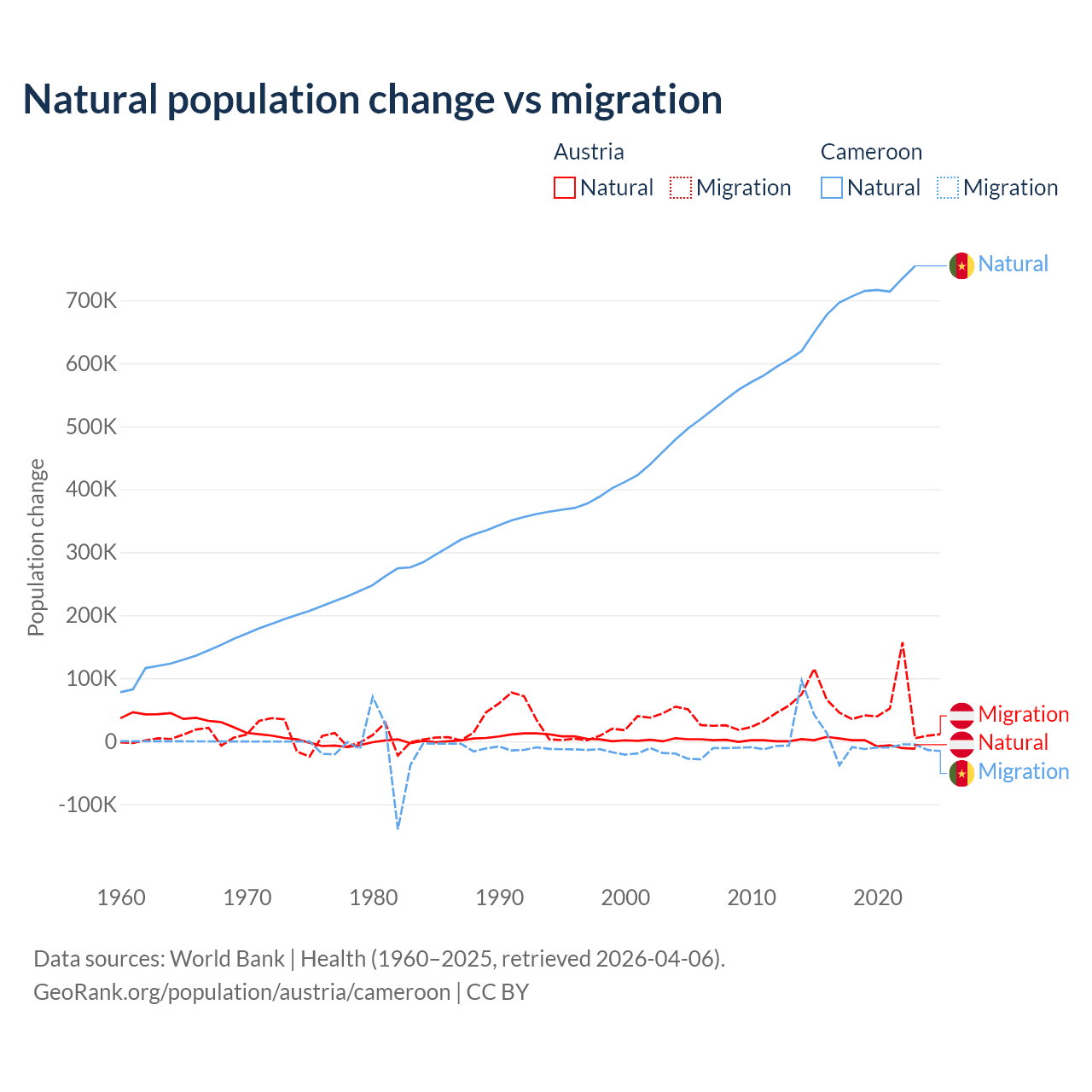 Over the last 10 years, 2.61% of the population change in Austria is from natural causes (a loss of 16,936 people) and 97.4% is from migration (a gain of 631,325 people). In Cameroon 99.1% is from natural causes (a gain of 6,982,395 people) and 0.9% is from migration (a gain of 63,139 people).