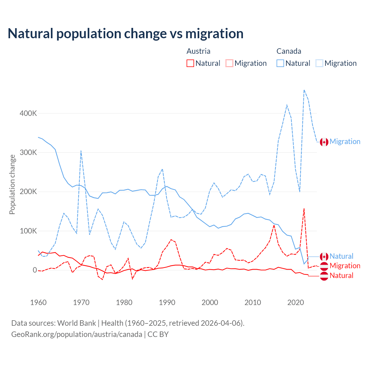 Over the last 10 years, 2.61% of the population change in Austria is from natural causes (a loss of 16,936 people) and 97.4% is from migration (a gain of 631,325 people). In Canada 19.4% is from natural causes (a gain of 789,345 people) and 80.6% is from migration (a gain of 3,276,554 people).