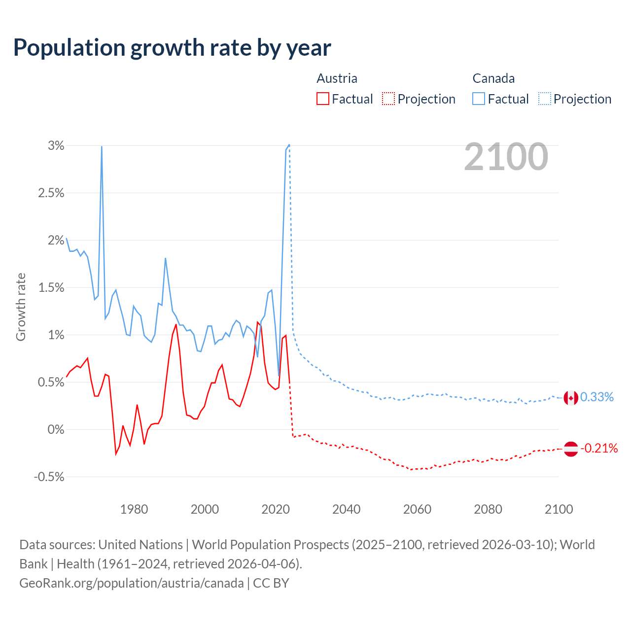 - For the last 10 years, Austria has had an average growth rate of +0.72% per year vs +1.5% in Canada.
