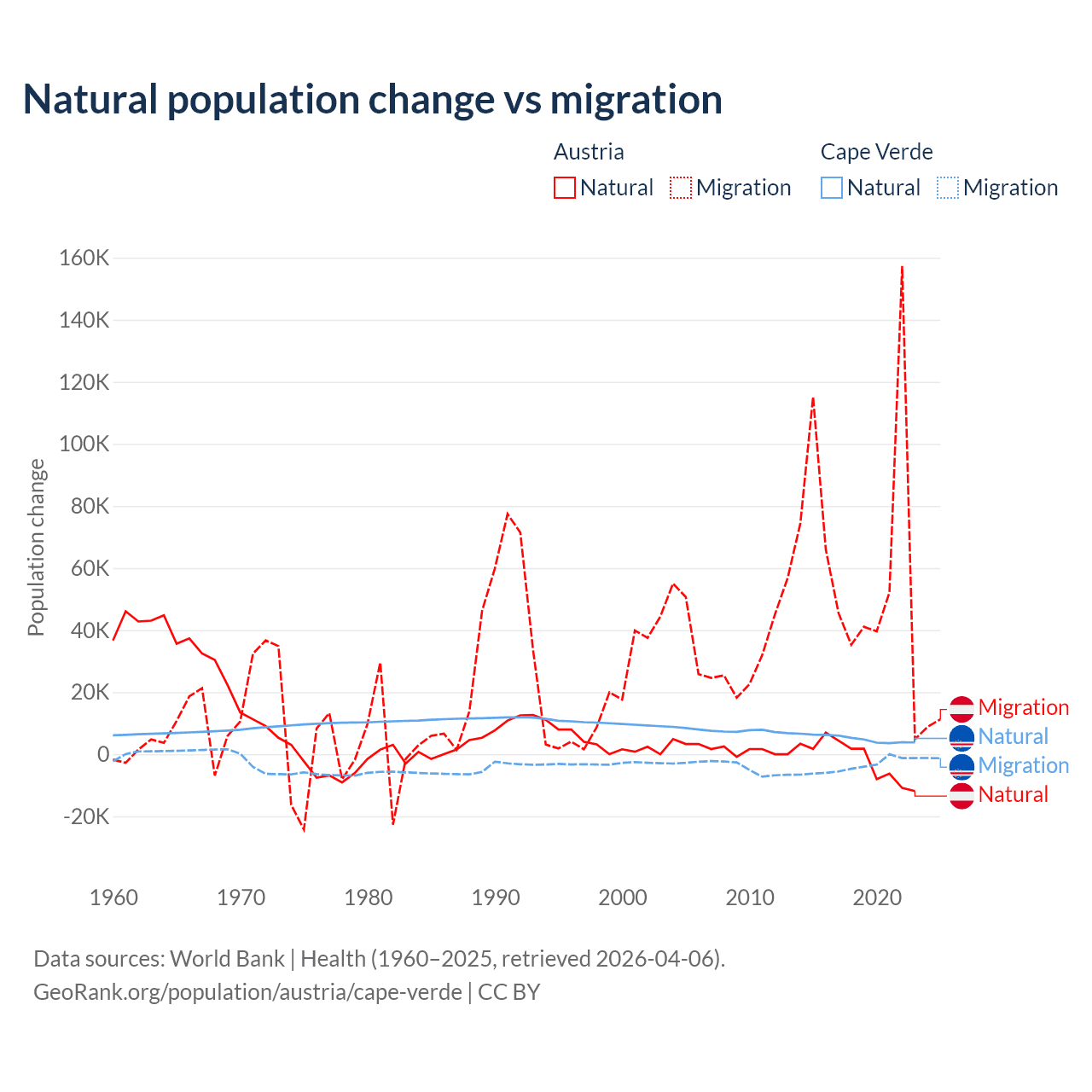 Over the last 10 years, 2.61% of the population change in Austria is from natural causes (a loss of 16,936 people) and 97.4% is from migration (a gain of 631,325 people). In Cape Verde 56.4% is from natural causes (a gain of 50,193 people) and 43.6% is from migration (a loss of 38,879 people).