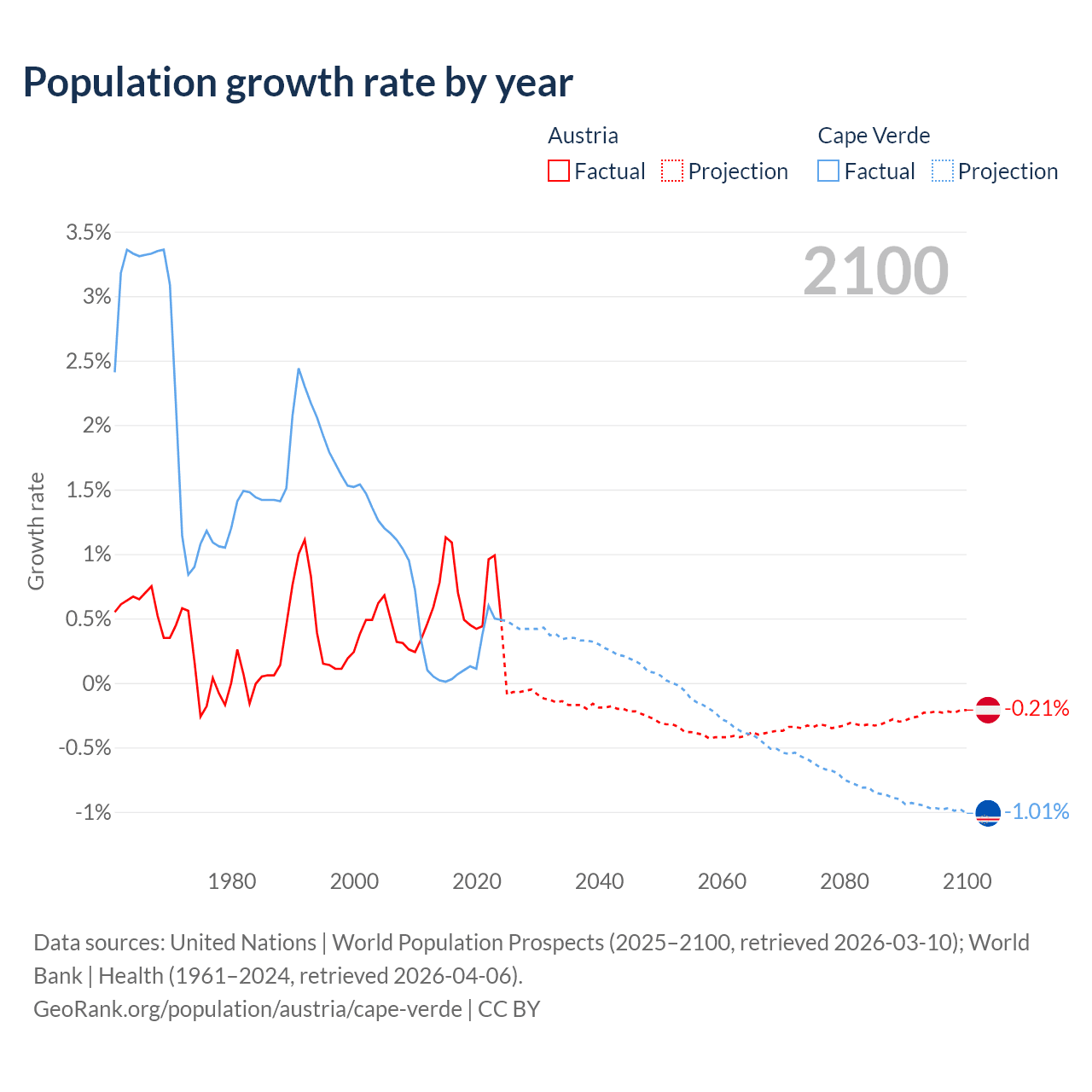 - For the last 10 years, Austria has had an average growth rate of +0.72% per year vs +0.22% in Cape Verde.