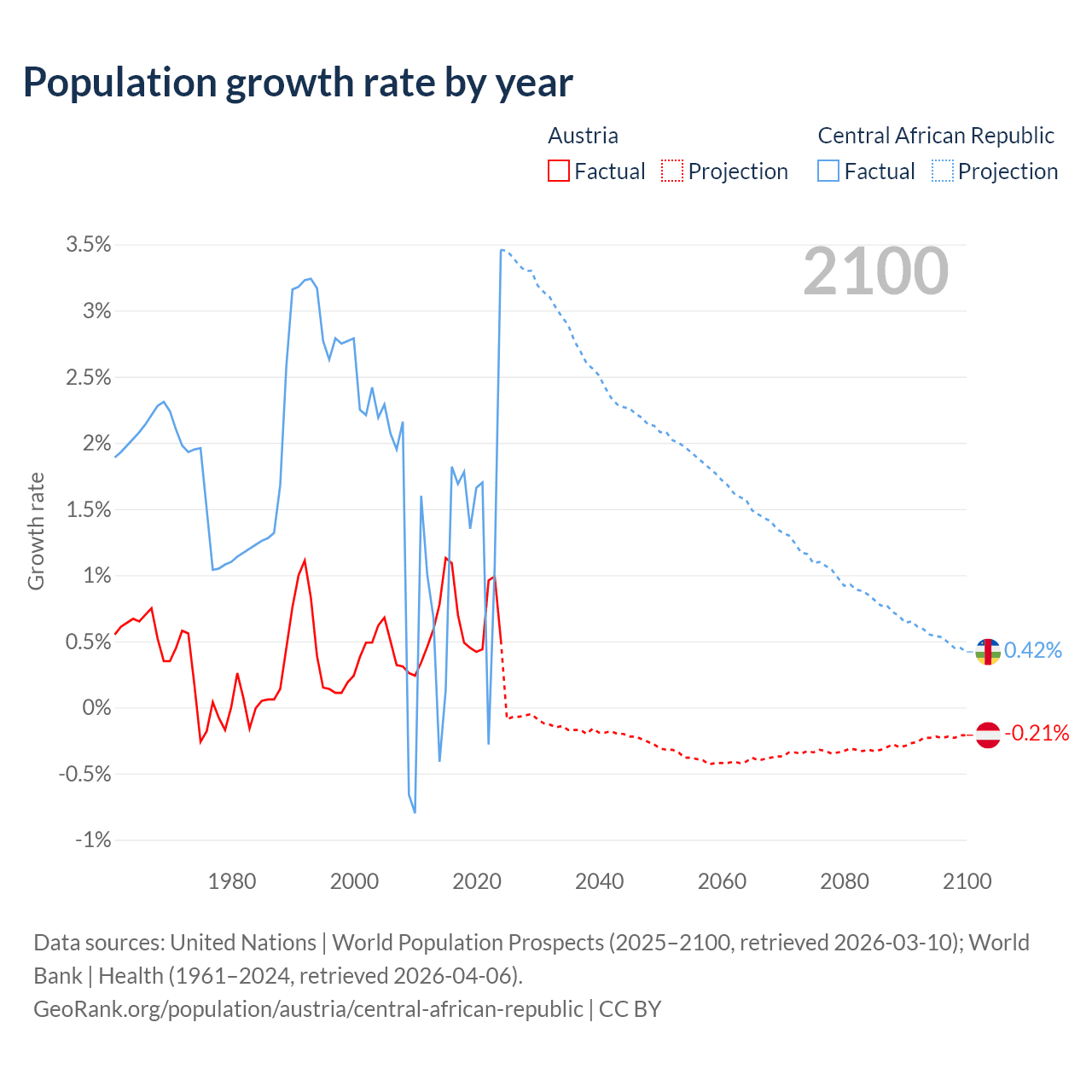 - For the last 10 years, Austria has had an average growth rate of +0.72% per year vs +1.27% in the Central African Republic.
