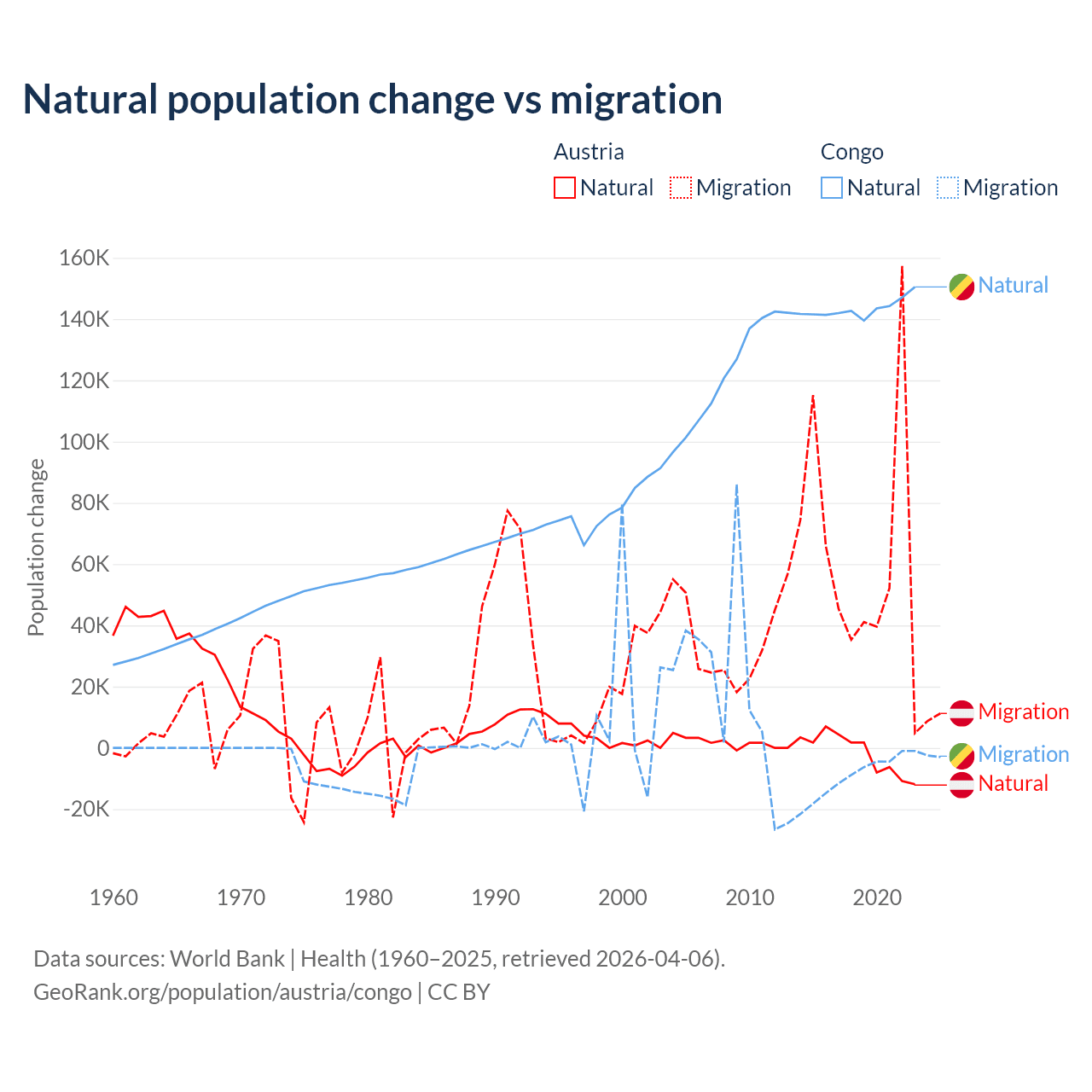 Over the last 10 years, 2.61% of the population change in Austria is from natural causes (a loss of 16,936 people) and 97.4% is from migration (a gain of 631,325 people). In the Congo 94% is from natural causes (a gain of 1,434,056 people) and 6.04% is from migration (a loss of 92,251 people).