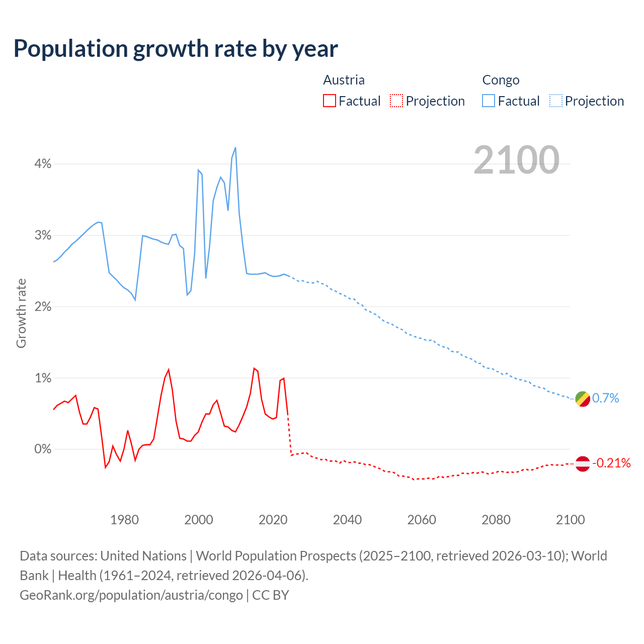 - For the last 10 years, Austria has had an average growth rate of +0.72% per year vs +2.44% in the Congo.