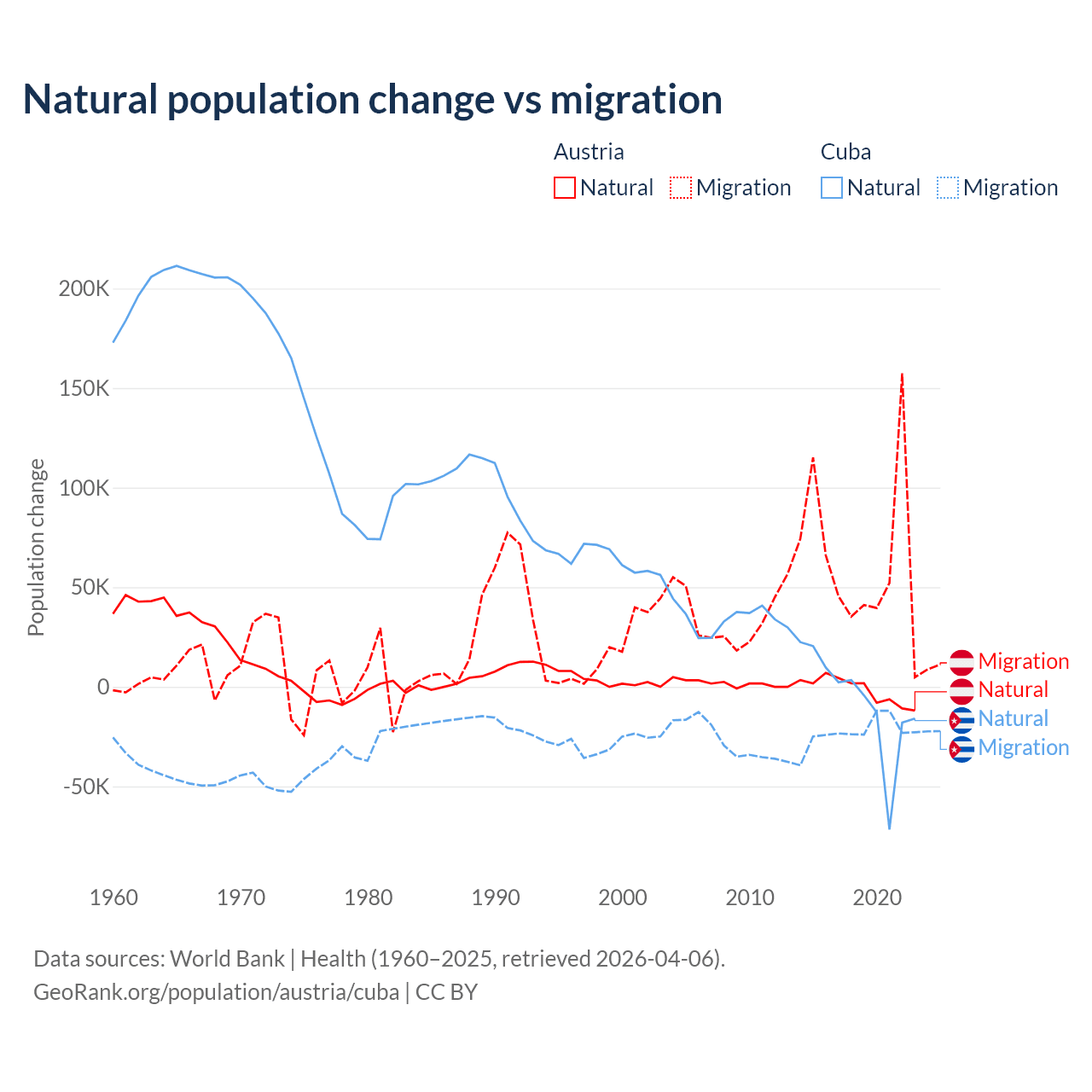 Over the last 10 years, 2.61% of the population change in Austria is from natural causes (a loss of 16,936 people) and 97.4% is from migration (a gain of 631,325 people). In Cuba 21.9% is from natural causes (a loss of 64,179 people) and 78.1% is from migration (a loss of 229,508 people).