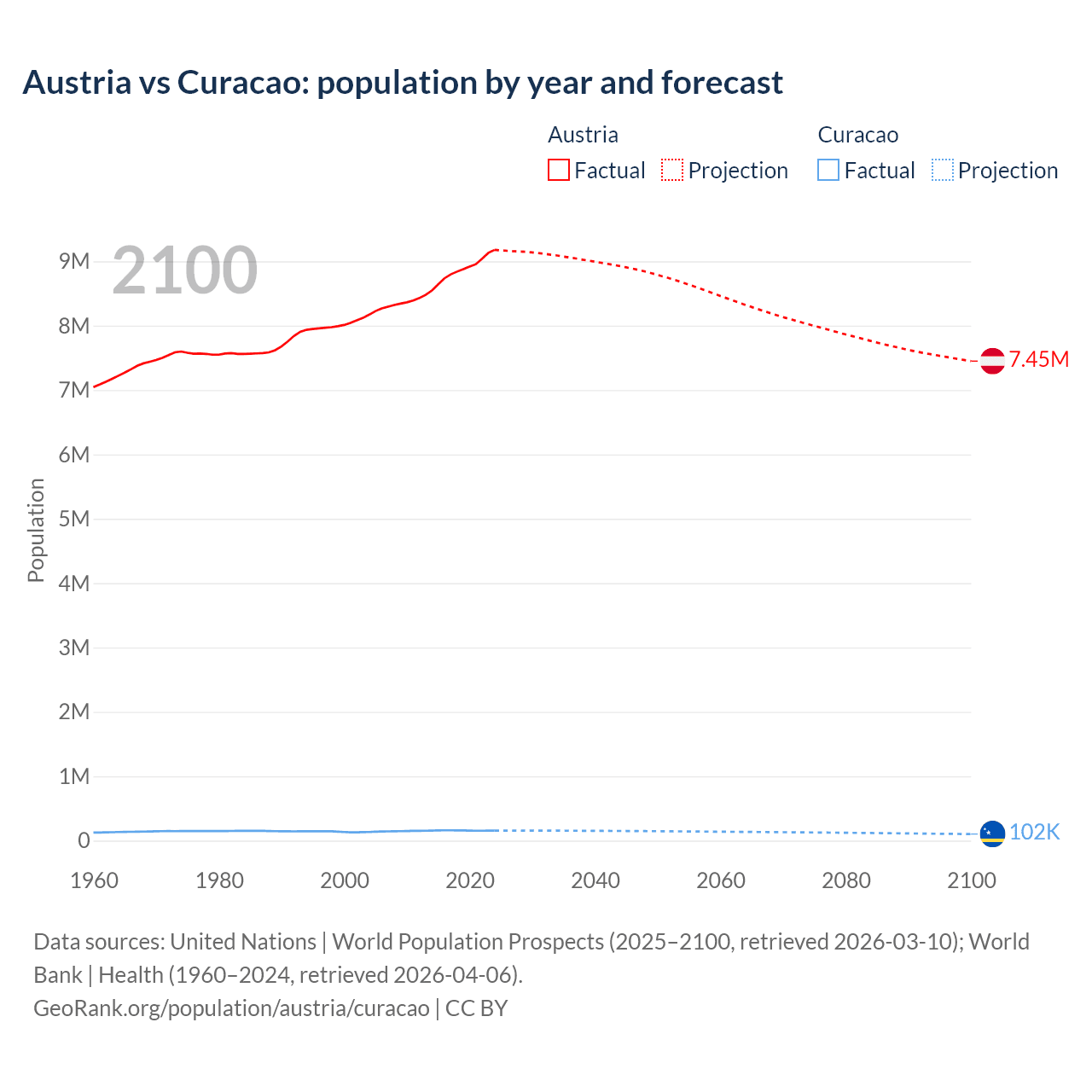 Austria vs Curacao: population by year and forecast
