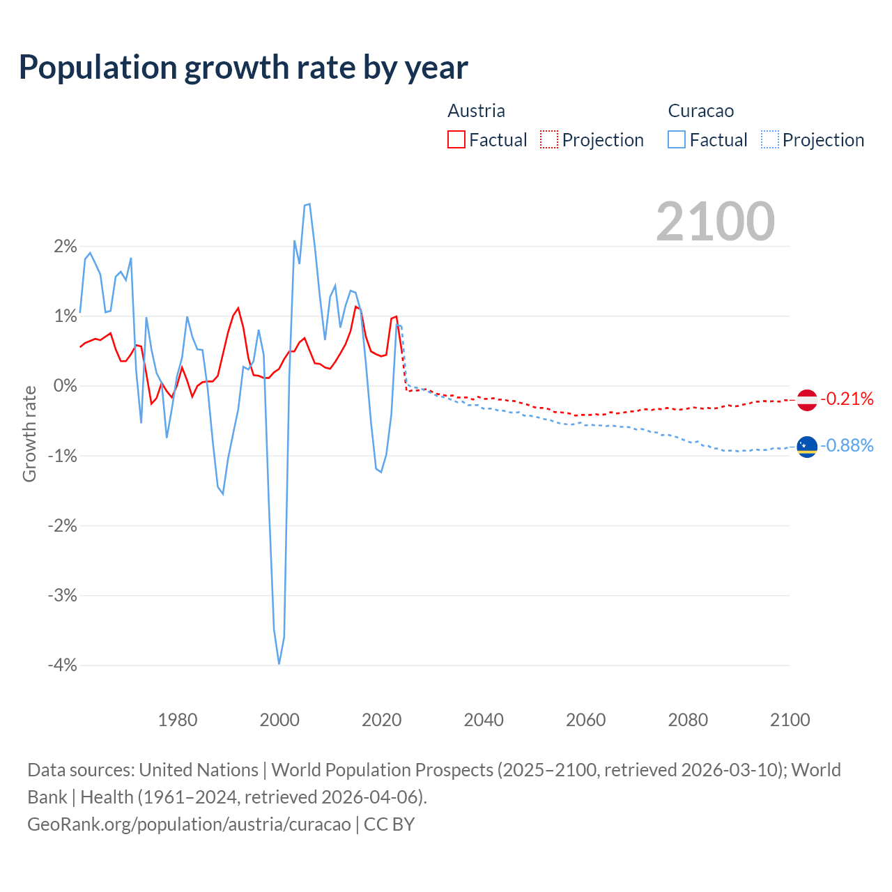 - For the last 10 years, Austria has had an average growth rate of +0.72% per year vs +0.13% in Curacao.