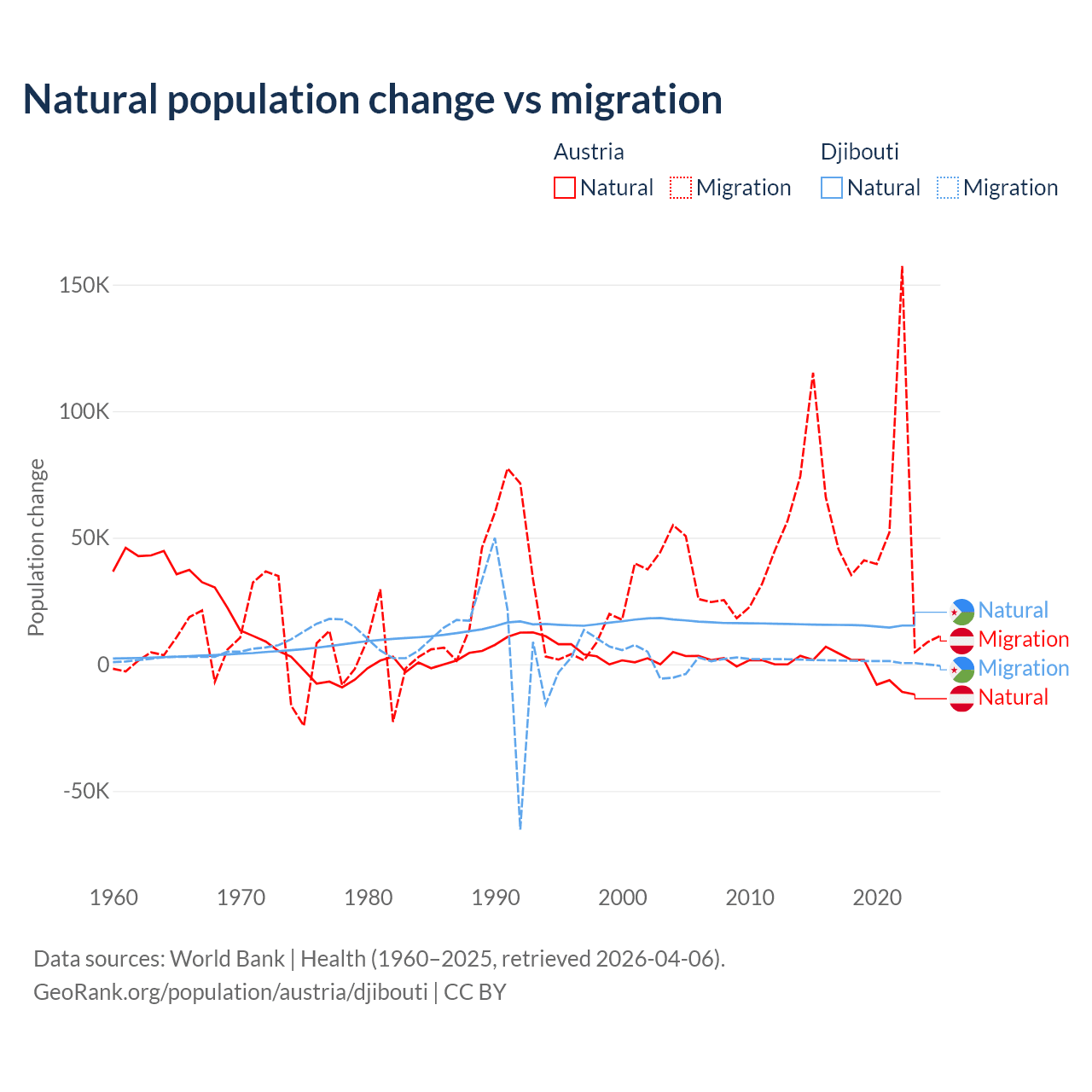 Over the last 10 years, 2.61% of the population change in Austria is from natural causes (a loss of 16,936 people) and 97.4% is from migration (a gain of 631,325 people). In Djibouti 92.1% is from natural causes (a gain of 153,892 people) and 7.87% is from migration (a gain of 13,138 people).