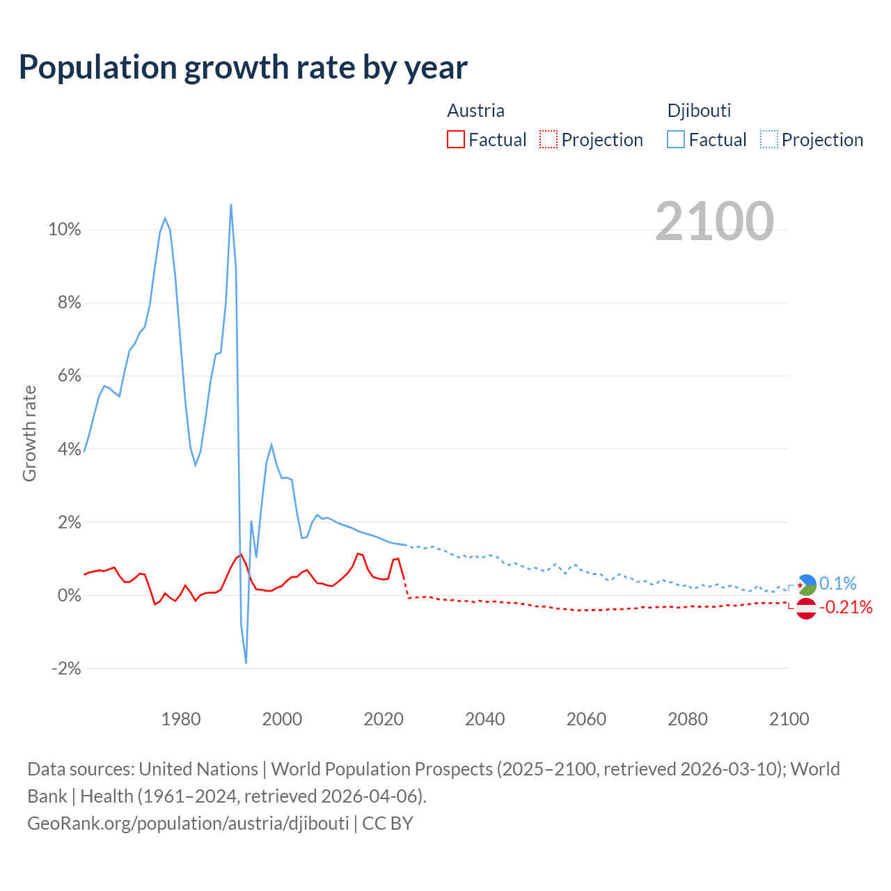 - For the last 10 years, Austria has had an average growth rate of +0.72% per year vs +1.57% in Djibouti.