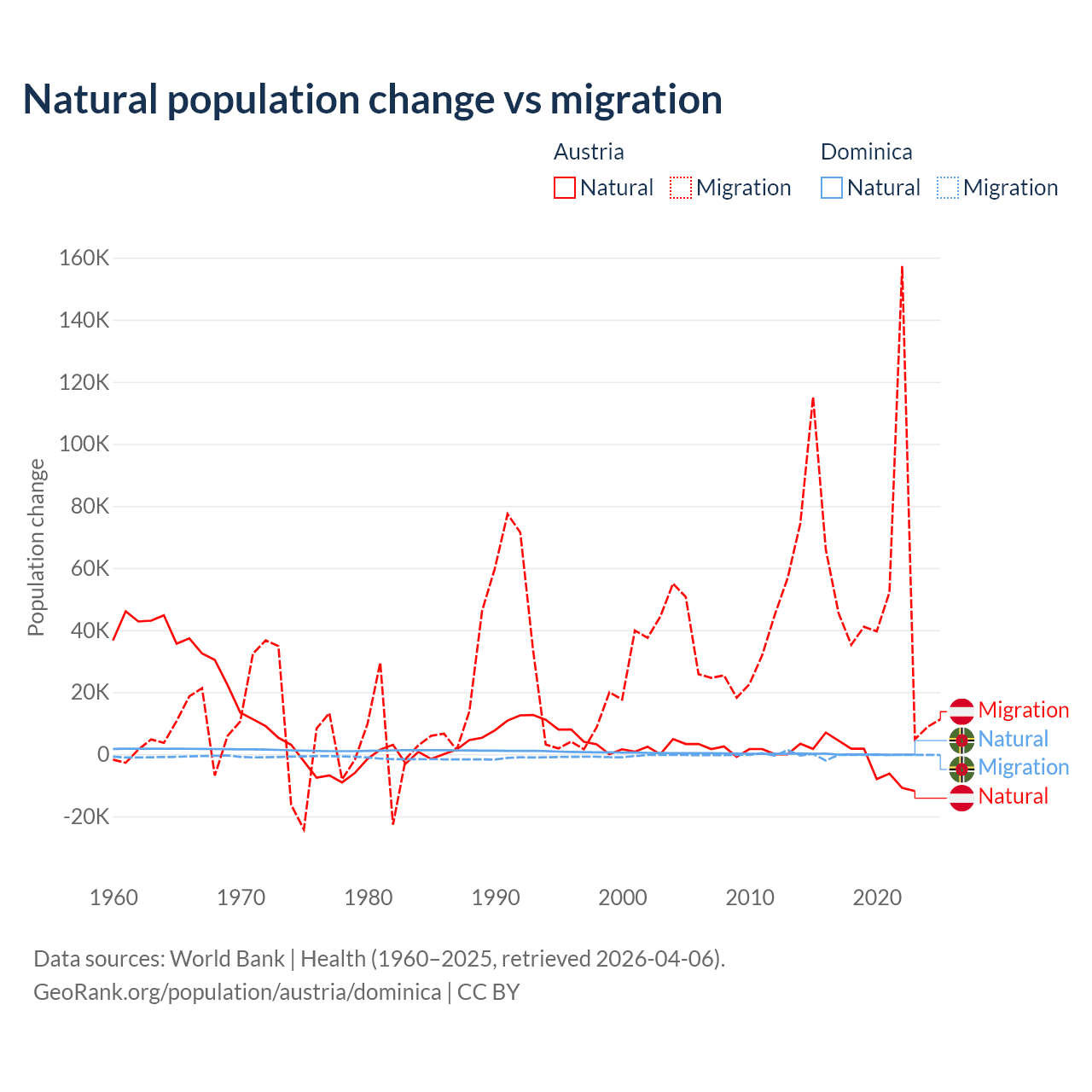 Over the last 10 years, 2.61% of the population change in Austria is from natural causes (a loss of 16,936 people) and 97.4% is from migration (a gain of 631,325 people). In Dominica 4.63% is from natural causes (a loss of 190 people) and 95.4% is from migration (a loss of 3,914 people).