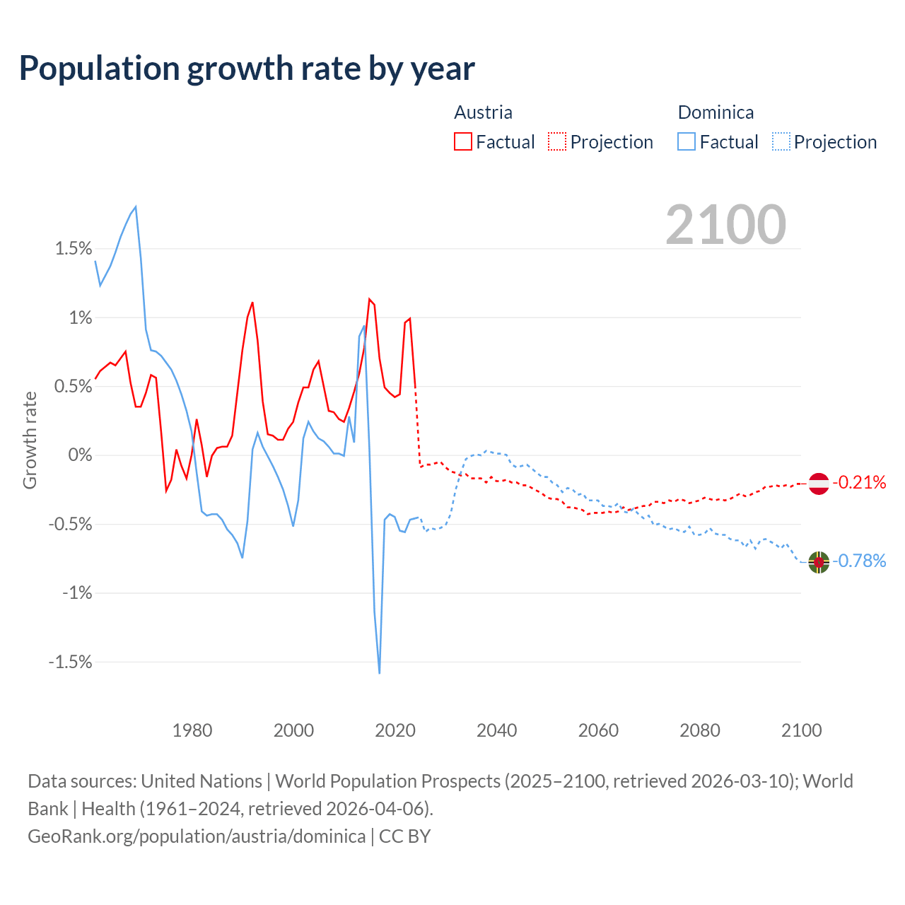 - For the last 10 years, Austria has had an average growth rate of +0.72% per year vs -0.47% in Dominica.