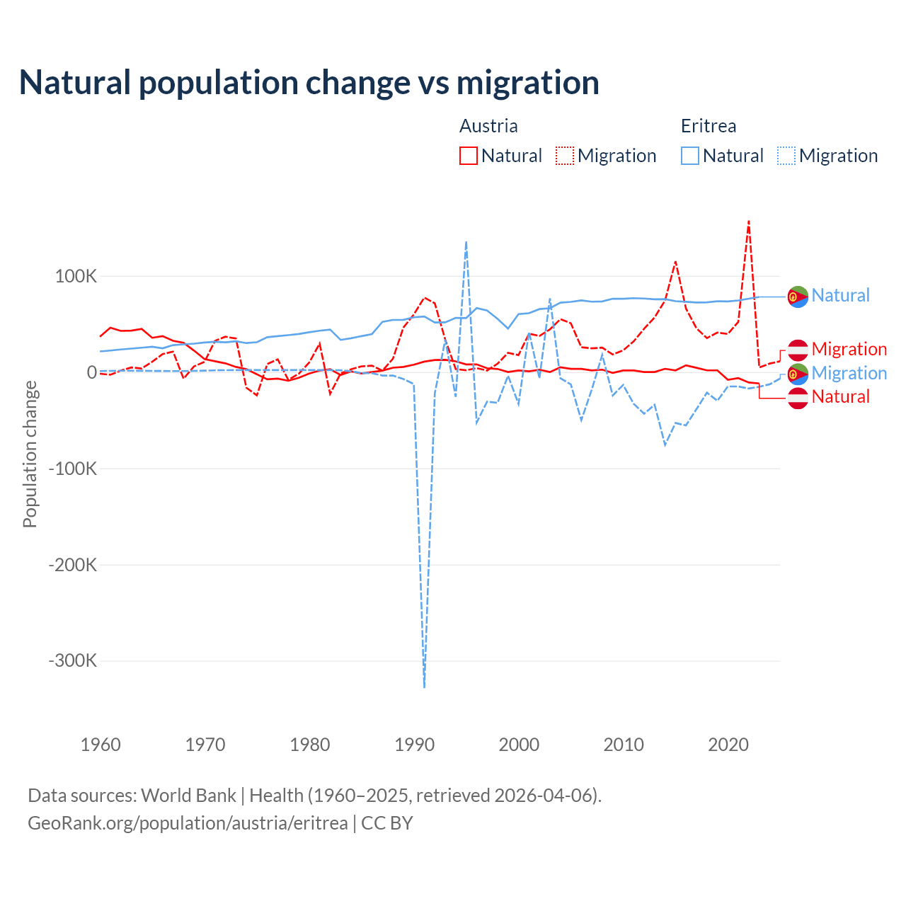 Over the last 10 years, 2.61% of the population change in Austria is from natural causes (a loss of 16,936 people) and 97.4% is from migration (a gain of 631,325 people). In Eritrea 68.8% is from natural causes (a gain of 742,837 people) and 31.2% is from migration (a loss of 336,243 people).