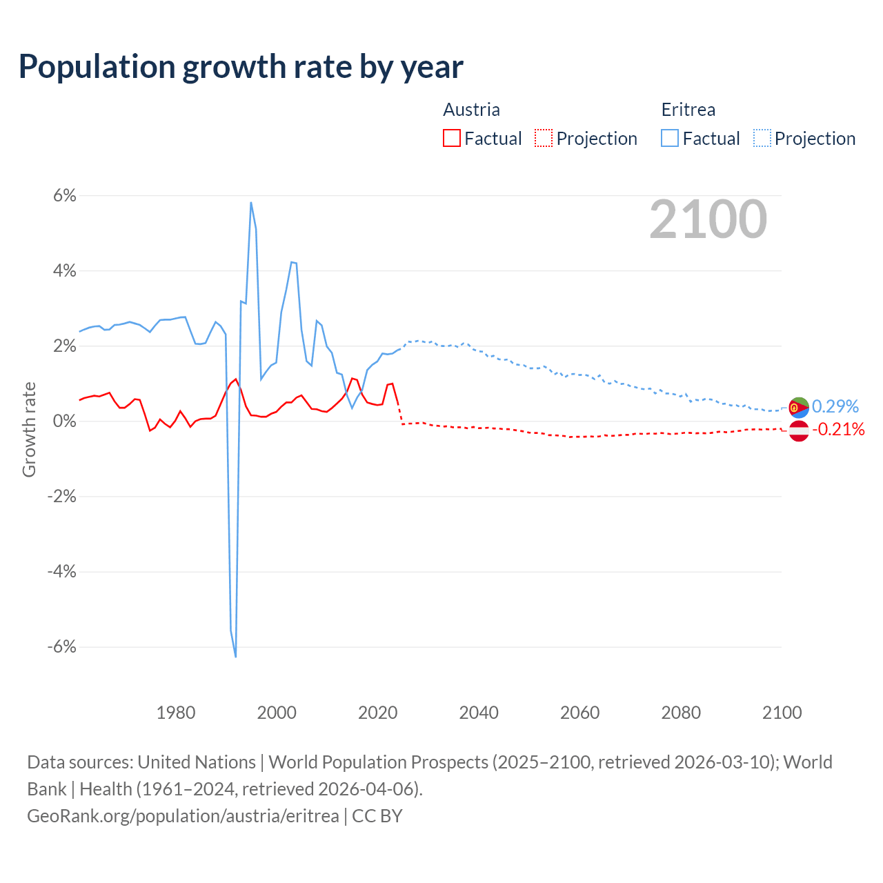 - For the last 10 years, Austria has had an average growth rate of +0.72% per year vs +1.28% in Eritrea.