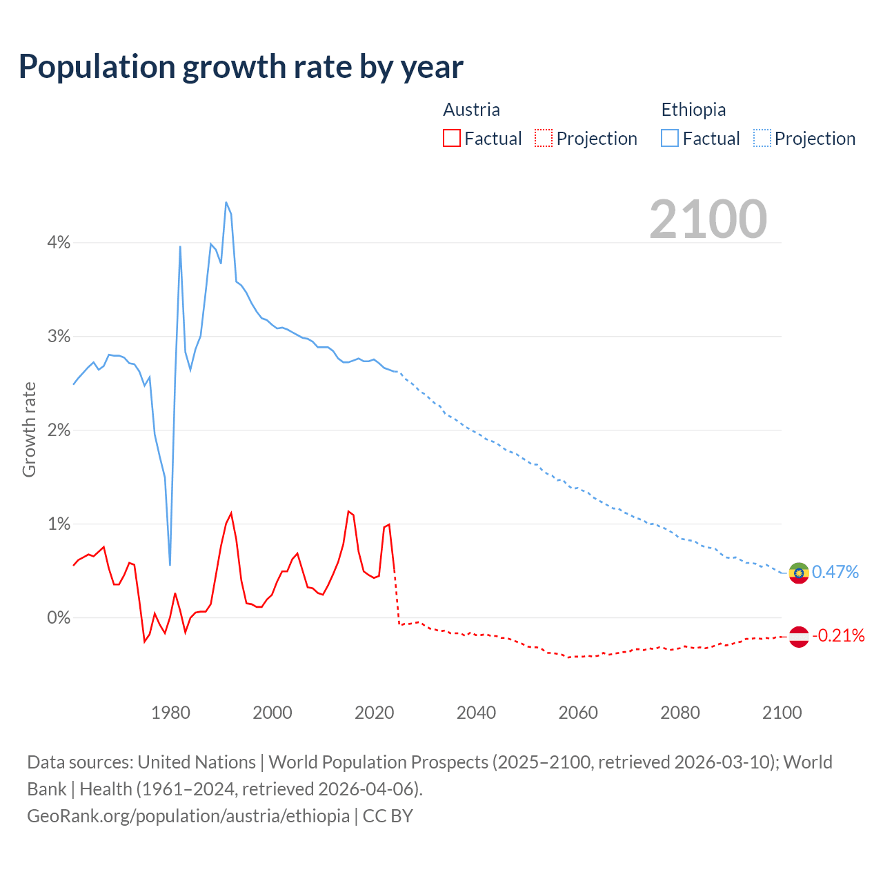 - For the last 10 years, Austria has had an average growth rate of +0.72% per year vs +2.71% in Ethiopia.