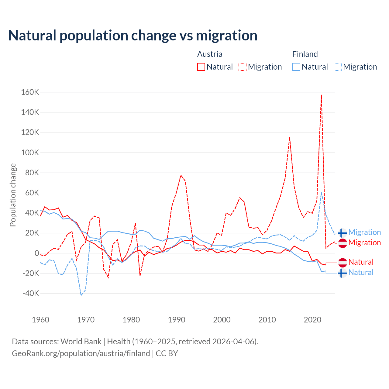 Over the last 10 years, 2.61% of the population change in Austria is from natural causes (a loss of 16,936 people) and 97.4% is from migration (a gain of 631,325 people). In Finland 22.5% is from natural causes (a loss of 65,560 people) and 77.5% is from migration (a gain of 225,237 people).