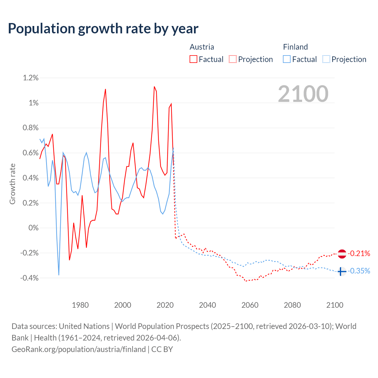 - For the last 10 years, Austria has had an average growth rate of +0.72% per year vs +0.3% in Finland.