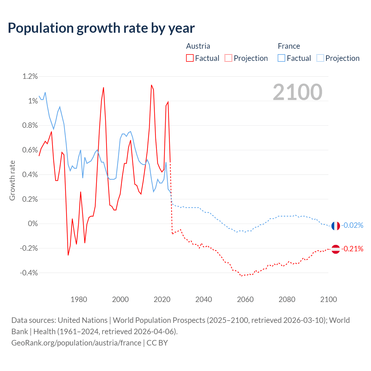 - For the last 10 years, Austria has had an average growth rate of +0.72% per year vs +0.35% in France.