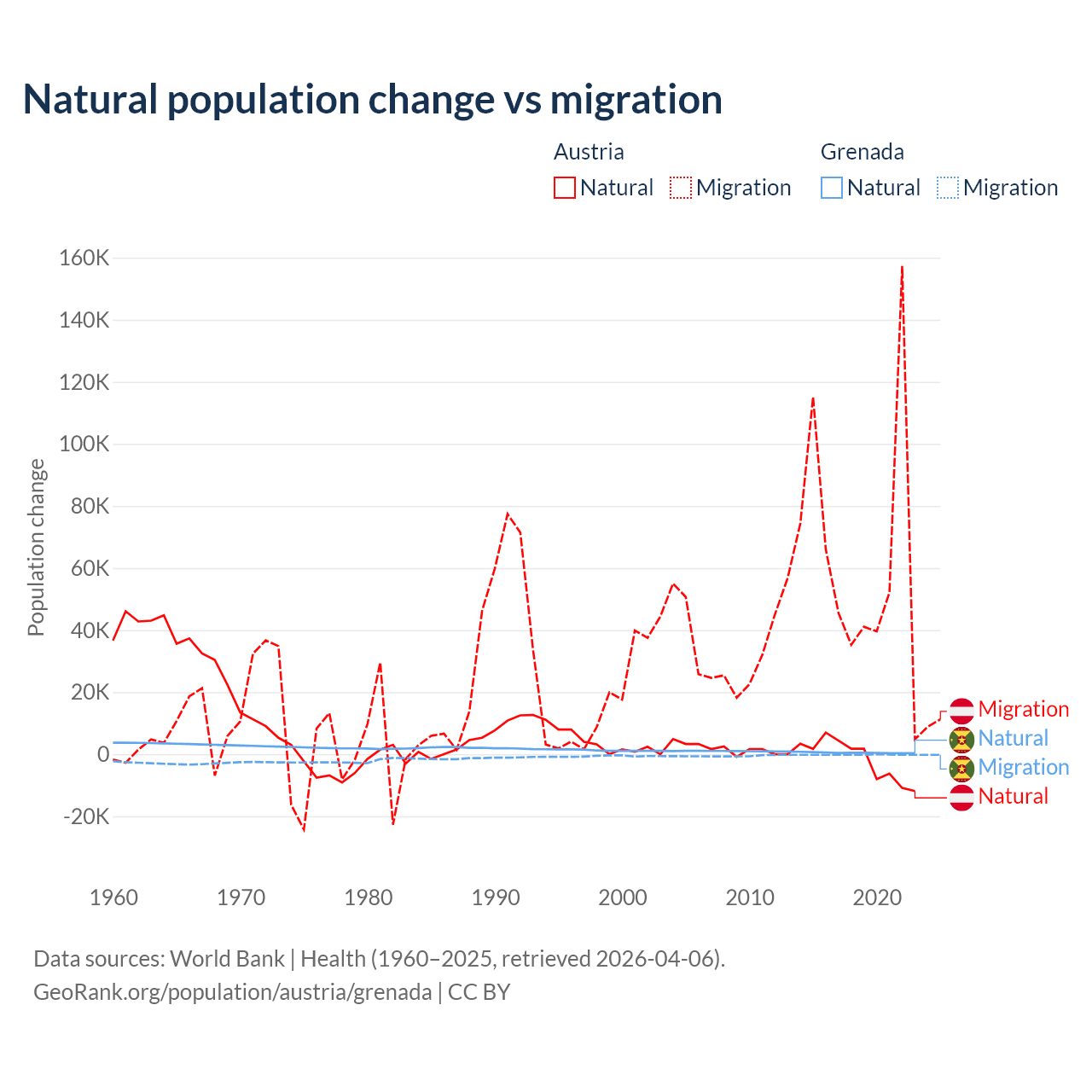 Over the last 10 years, 2.61% of the population change in Austria is from natural causes (a loss of 16,936 people) and 97.4% is from migration (a gain of 631,325 people). In Grenada 76% is from natural causes (a gain of 4,850 people) and 24% is from migration (a loss of 1,535 people).