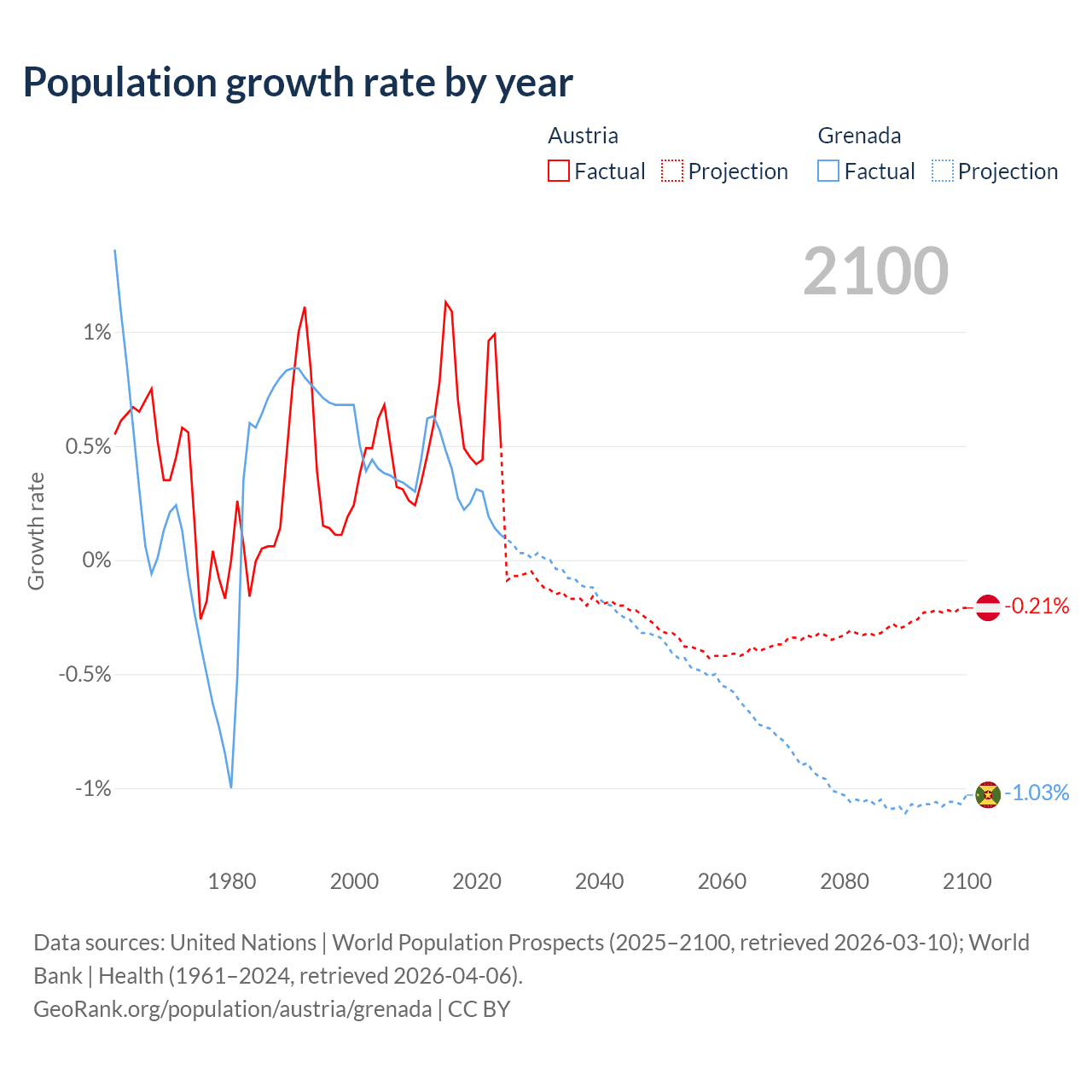 - For the last 10 years, Austria has had an average growth rate of +0.72% per year vs +0.29% in Grenada.