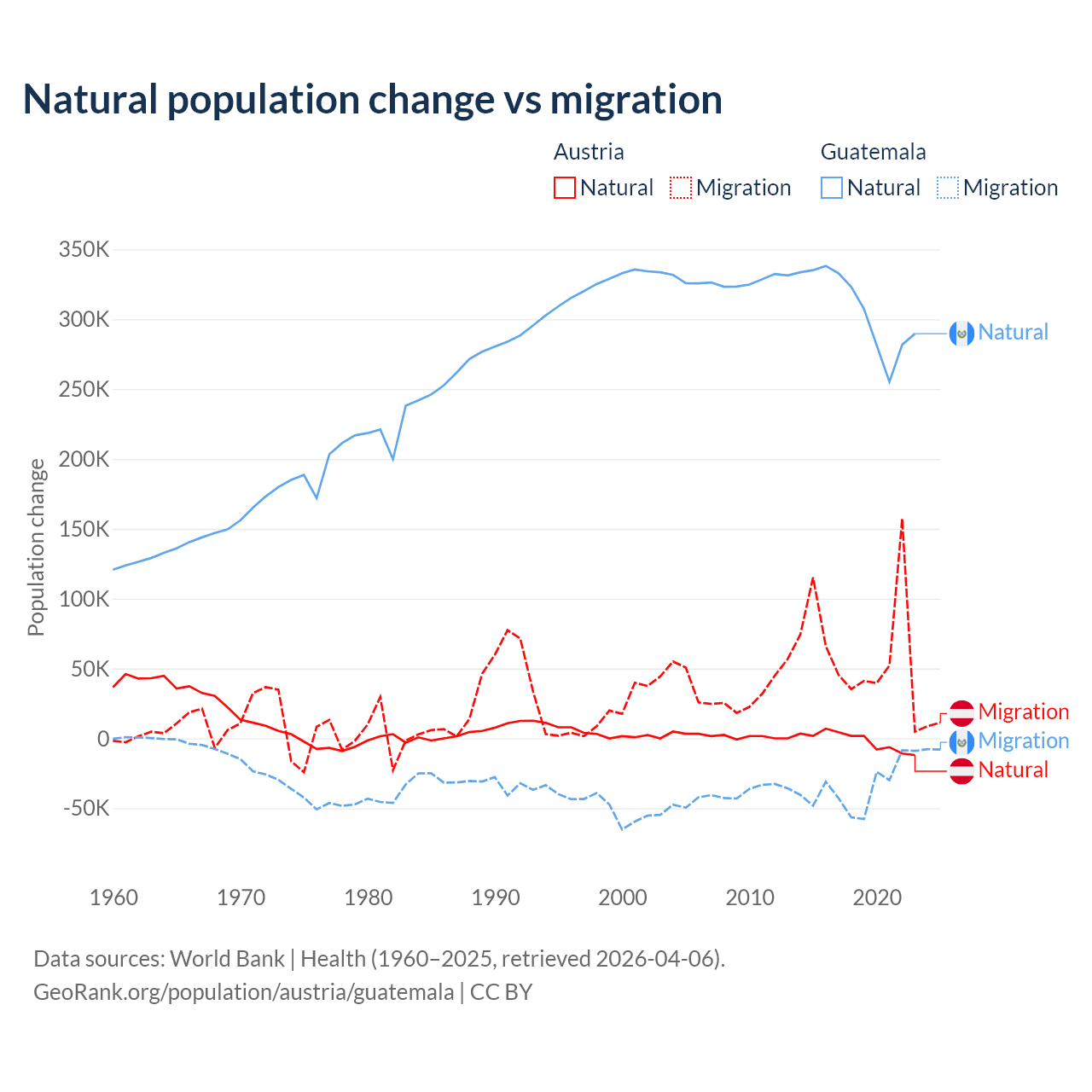 Over the last 10 years, 2.61% of the population change in Austria is from natural causes (a loss of 16,936 people) and 97.4% is from migration (a gain of 631,325 people). In Guatemala 89.8% is from natural causes (a gain of 3,077,847 people) and 10.2% is from migration (a loss of 347,818 people).