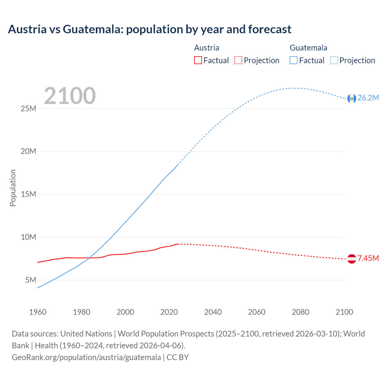 The latest officially reported population of Austria was 9,177,982 in 2024 vs 18,406,359 people in Guatemala in 2024. In 2026, based on the adjusted UN estimation, the current Austria's population is 9,163,419 people compared to 19,049,936 in Guatemala.