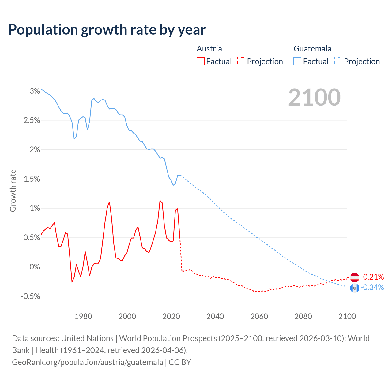 - For the last 10 years, Austria has had an average growth rate of +0.72% per year vs +1.64% in Guatemala.